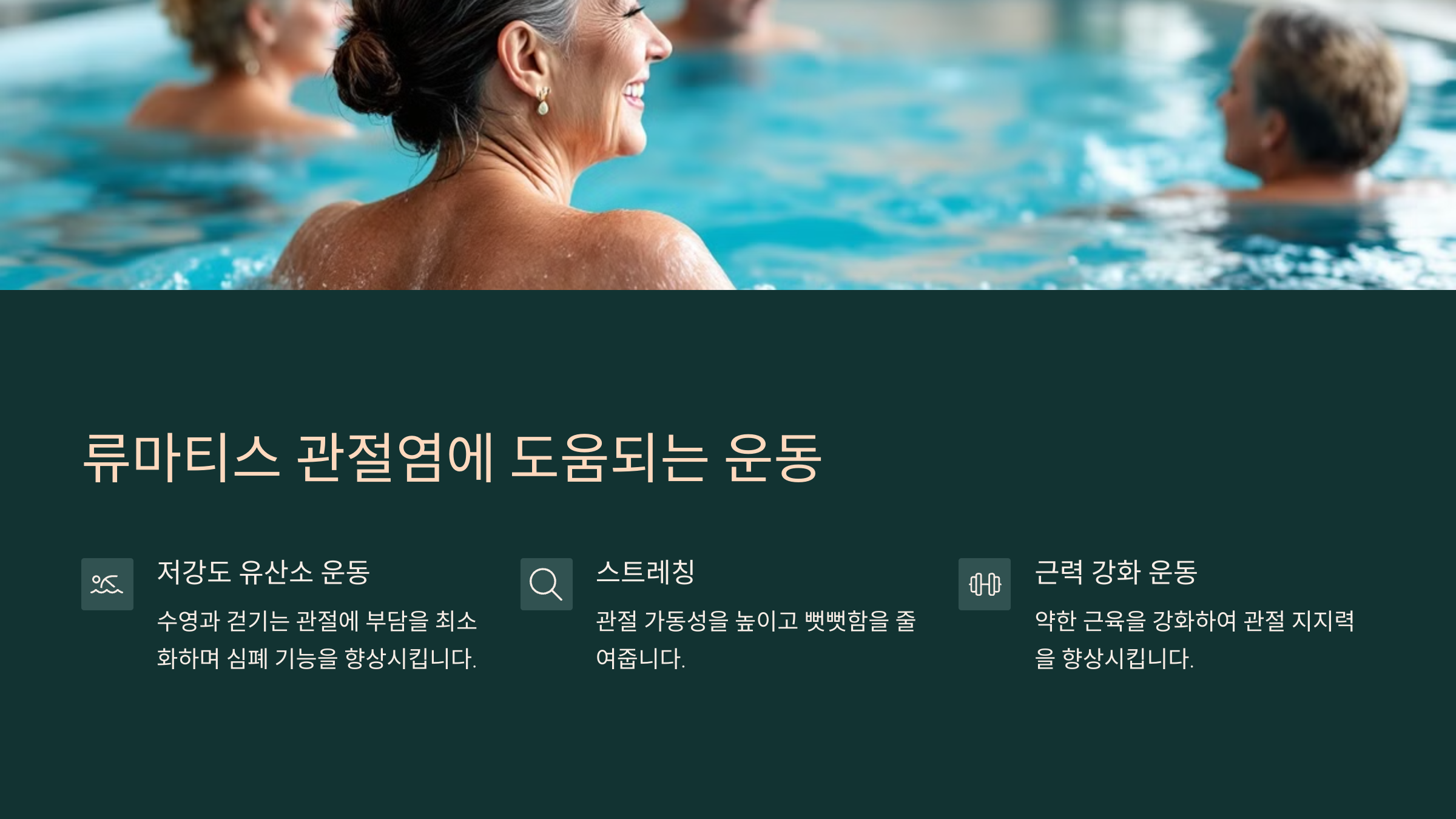 A3. 맞아요. 물의 부력 덕분에 체중 부담 없이 전신을 움직일 수 있어요. 통증이 있는 날에도 비교적 안전하게 할 수 있는 운동이에요.