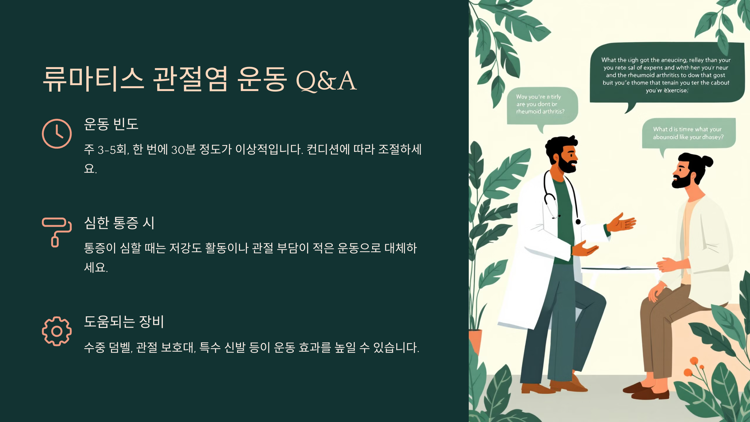 특히 스트레칭과 저강도 유산소 운동은 아침에 관절이 뻣뻣한 증상을 줄이는 데 좋아요. 아침마다 부드러운 관절 움직임을 유도하면, 하루를 덜 힘들게 시작할 수 있어요. 제가 생각했을 때 이런 부분이 환자 입장에서 가장 체감되는 변화가 아닐까 싶어요. 😊