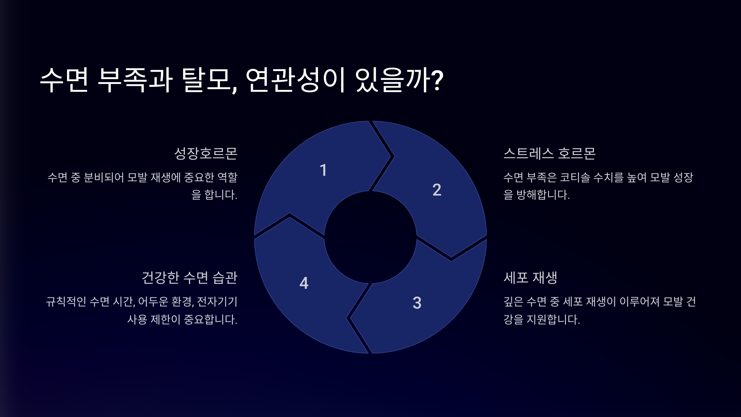 충분한 수면을 취하지 않으면 모발 성장에 중요한 역할을 하는 성장호르몬이 제대로 분비되지 않아요. 이 호르몬은 주로 밤 10시에서 새벽 2시 사이에 활발하게 생성되므로, 이 시간에 깊은 수면을 취하는 것이 중요해요.