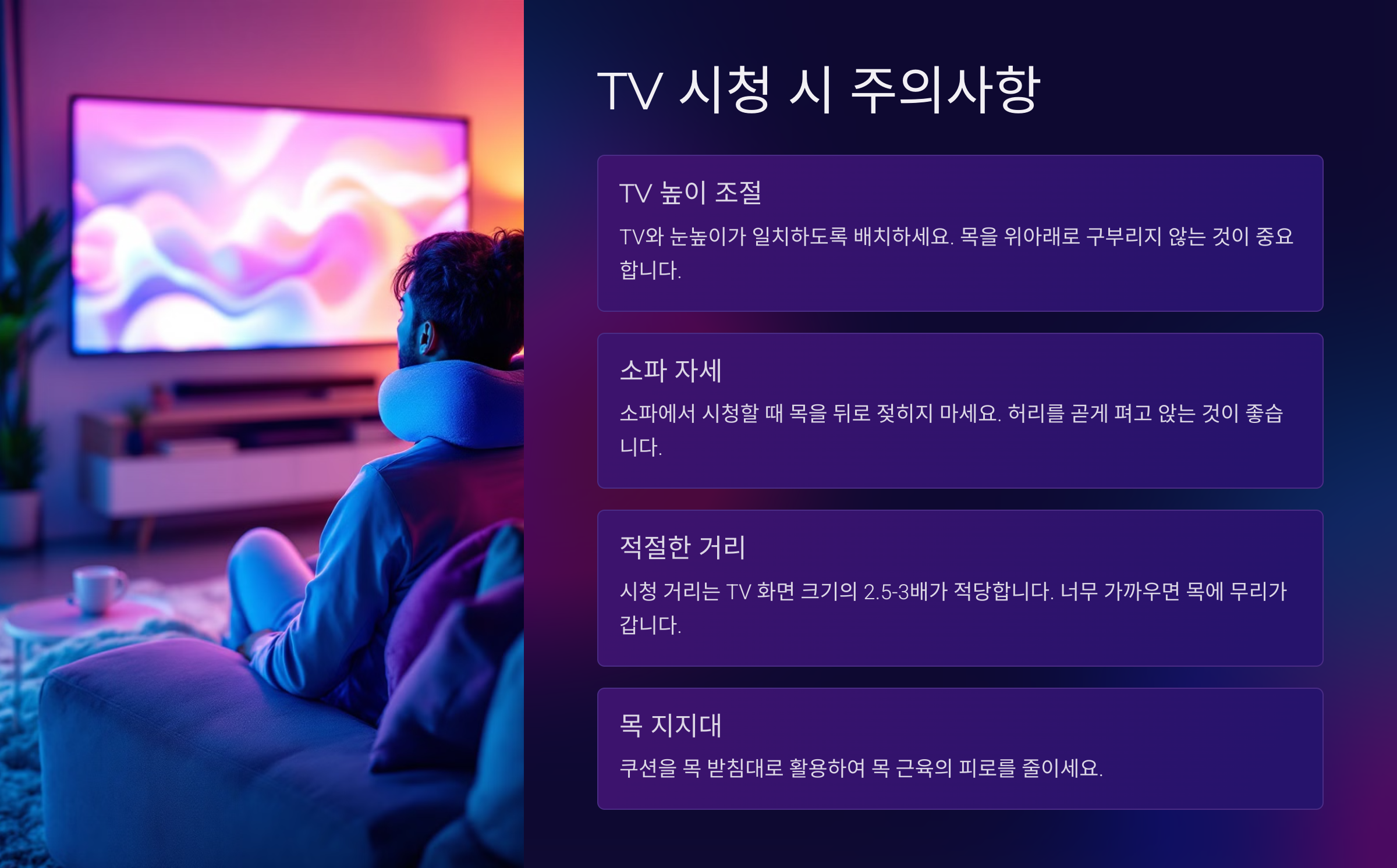 편안함이 목 건강을 해치는 함정일 수 있어요. TV 볼 땐 자세부터 다시 점검해보는 게 좋겠죠? 😊