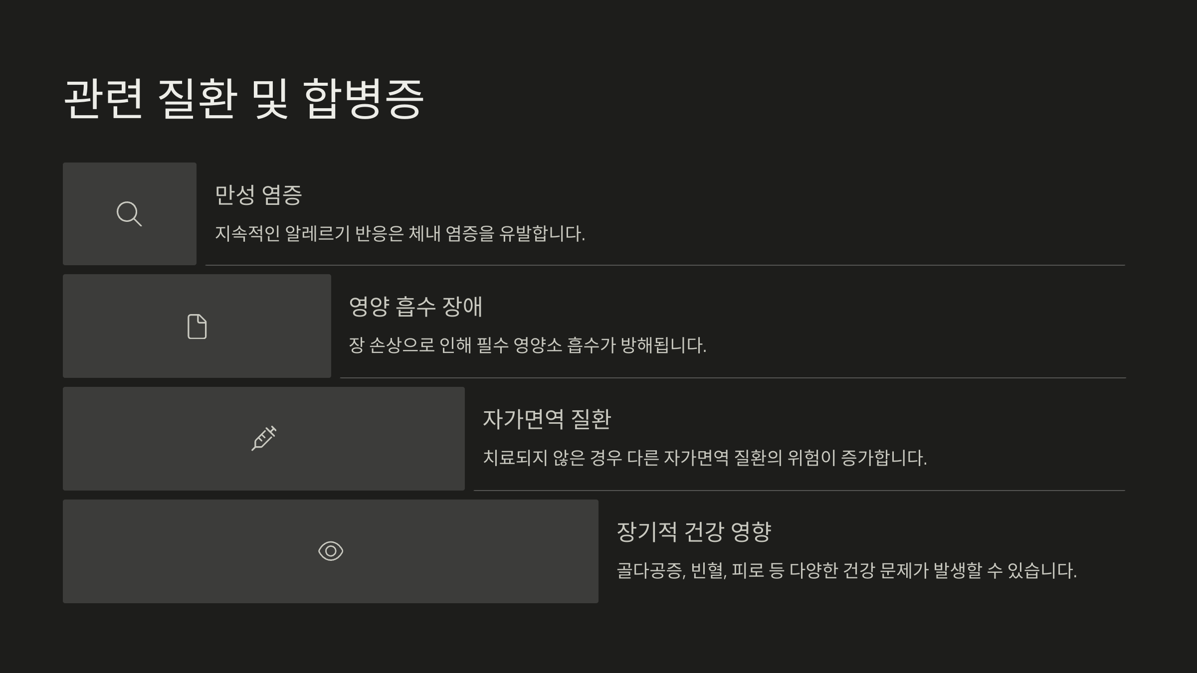 | 주요 증상 | 가려움, 호흡곤란, 두드러기 | 복부 팽만, 피로감, 속 더부룩함 |