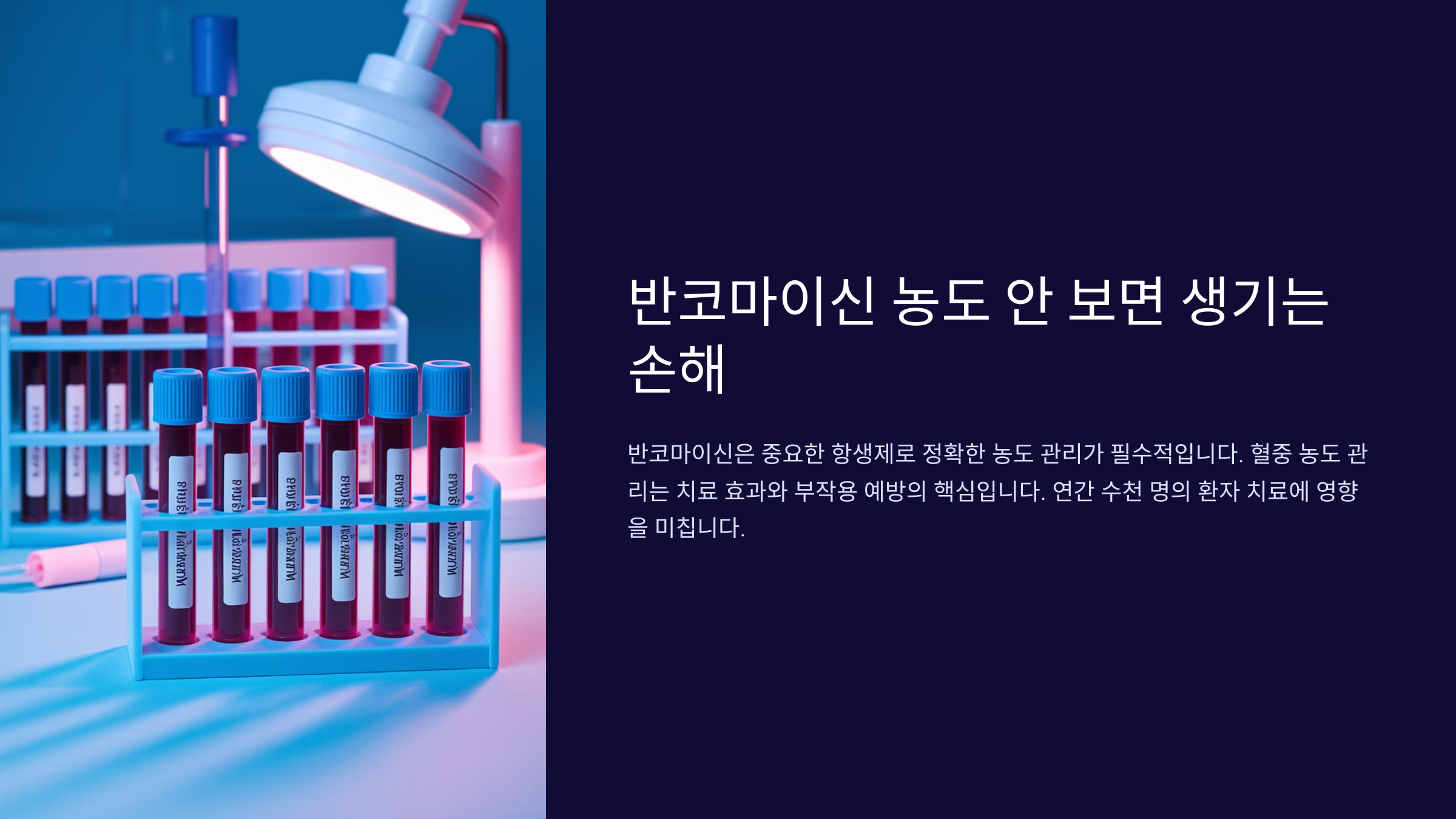 반코마이신은 강력한 항생제 중 하나로, 그 농도를 제대로 관리하지 않으면 신장 손상이나 치료 실패 같은 심각한 부작용을 초래할 수 있어요. 특히 농도를 정밀하게 조절해야 하는 이유는 이 약물이 체내에서 일정 범위 이상으로 높거나 낮으면 효과가 떨어지거나 독성이 발생하기 때문이에요.