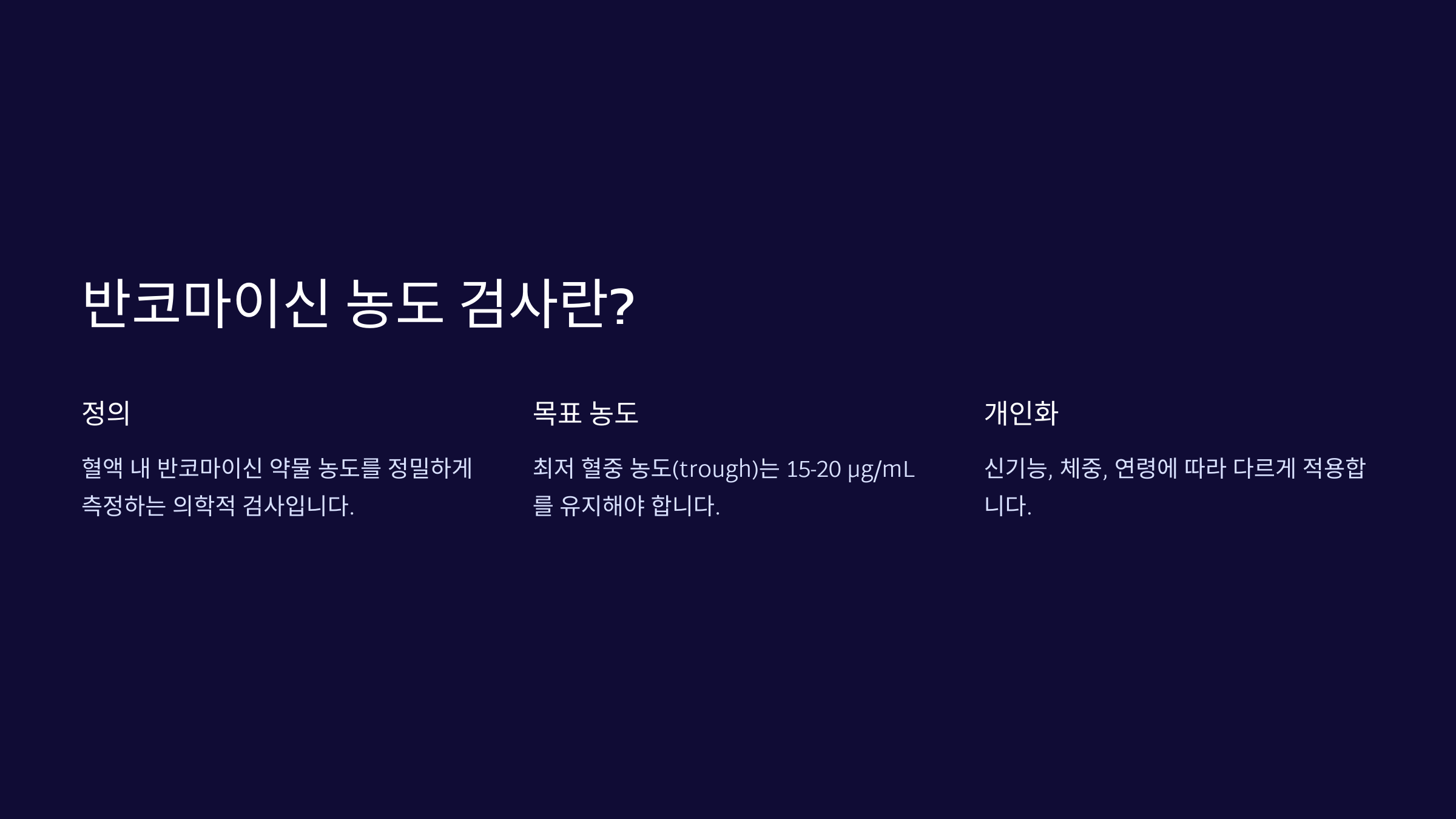 반코마이신 농도 검사는 혈액 내에 있는 반코마이신의 농도를 측정하는 검사예요. 이 검사는 약물이 체내에서 얼마나 잘 대사되고 있는지를 판단하는 기준이 되고, 환자마다 신장 기능이나 체중, 나이 등이 다르기 때문에 그에 따라 적절한 농도를 유지하는 게 핵심이에요.
