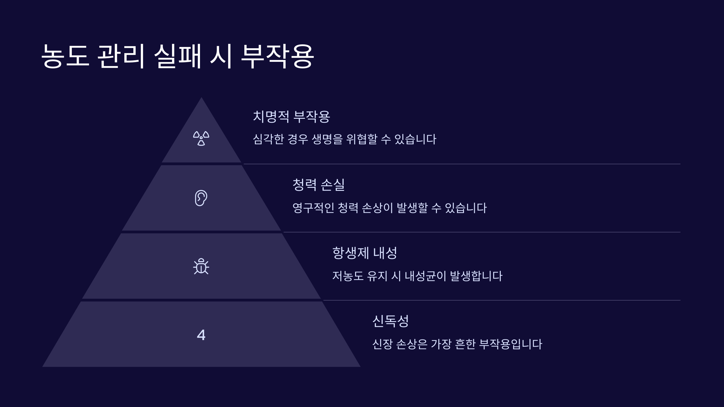 또한 고농도가 유지되면 '이독성(Ototoxicity)'이라는 귀 관련 부작용도 나타날 수 있어요. 이건 청력 손실, 이명, 평형감각 이상 등으로 이어지는데, 한번 손상되면 되돌리기 힘들어요. 특히 고령자나 신장이 약한 분들에게 많이 나타나요.