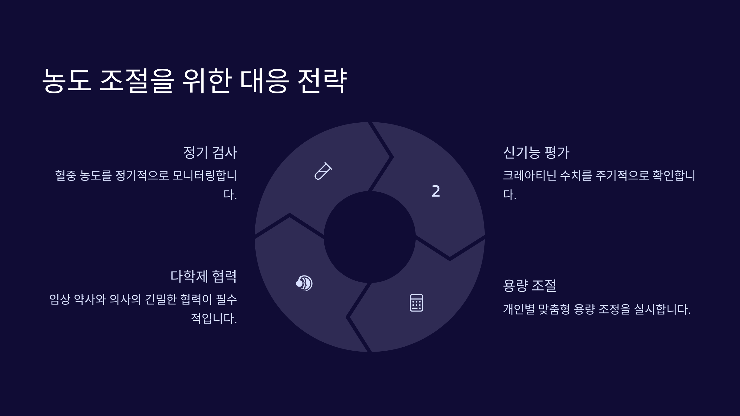 농도가 너무 높다면 첫 번째 전략은 ‘용량 감소’예요. 투약량을 10~20% 줄이는 방법이 일반적이고, 상태가 심각할 경우 1회 투약을 건너뛰기도 해요. 물론 의사와 약사가 협의해서 결정해야 해요.