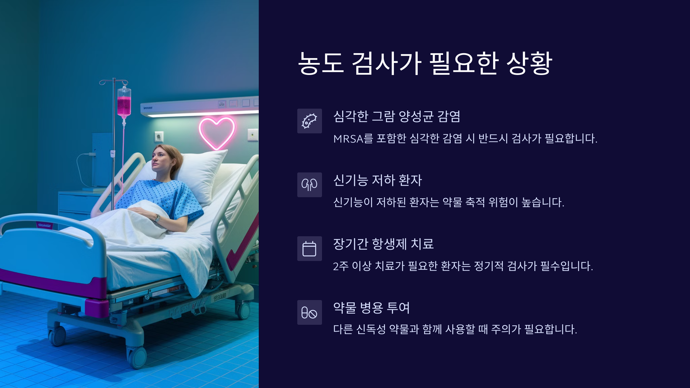 검사는 보통 정맥주사로 투약하는 환자에게 시행되며, 경구 투여에는 적용되지 않아요. 이유는 반코마이신이 경구로는 거의 흡수되지 않아 혈중 농도에 의미가 없기 때문이죠.