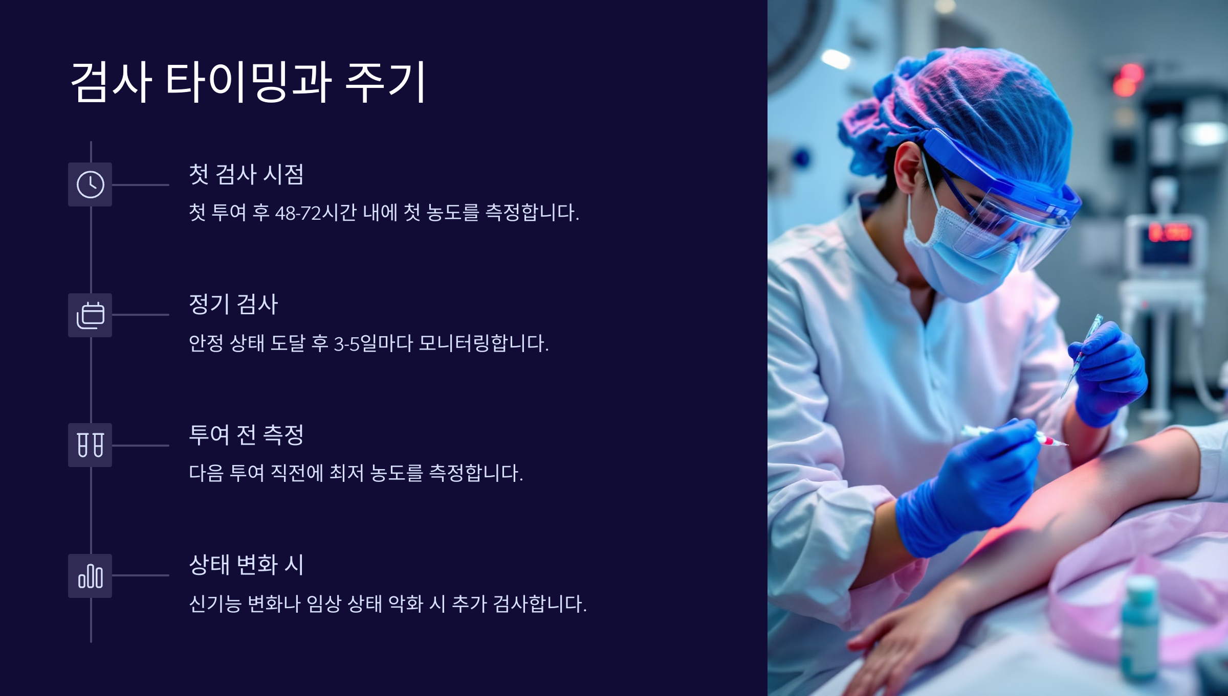 혈중 농도는 대개 투약 3일 이내에 안정화되기 시작하지만, 감염이 심하거나 약물 대사가 느린 경우에는 더 긴 시간이 필요할 수도 있어요. 그래서 3일째에 첫 검사, 이후 2~3일마다 재검사를 권장하죠.