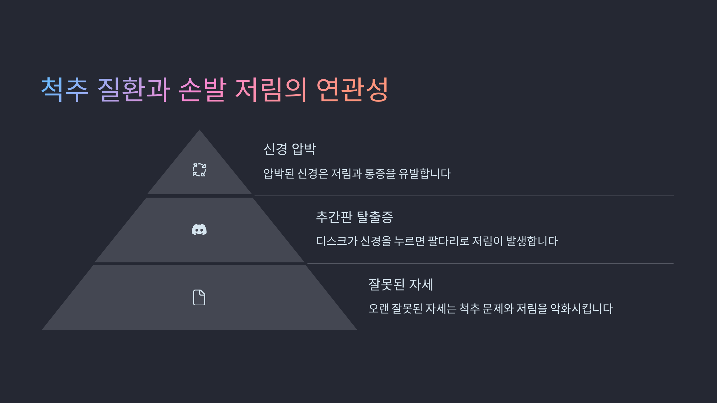 A3. 디스크가 신경을 누르면 저림, 감각 이상, 통증이 생겨요. 손이나 발 끝까지 증상이 이어질 수 있어요.