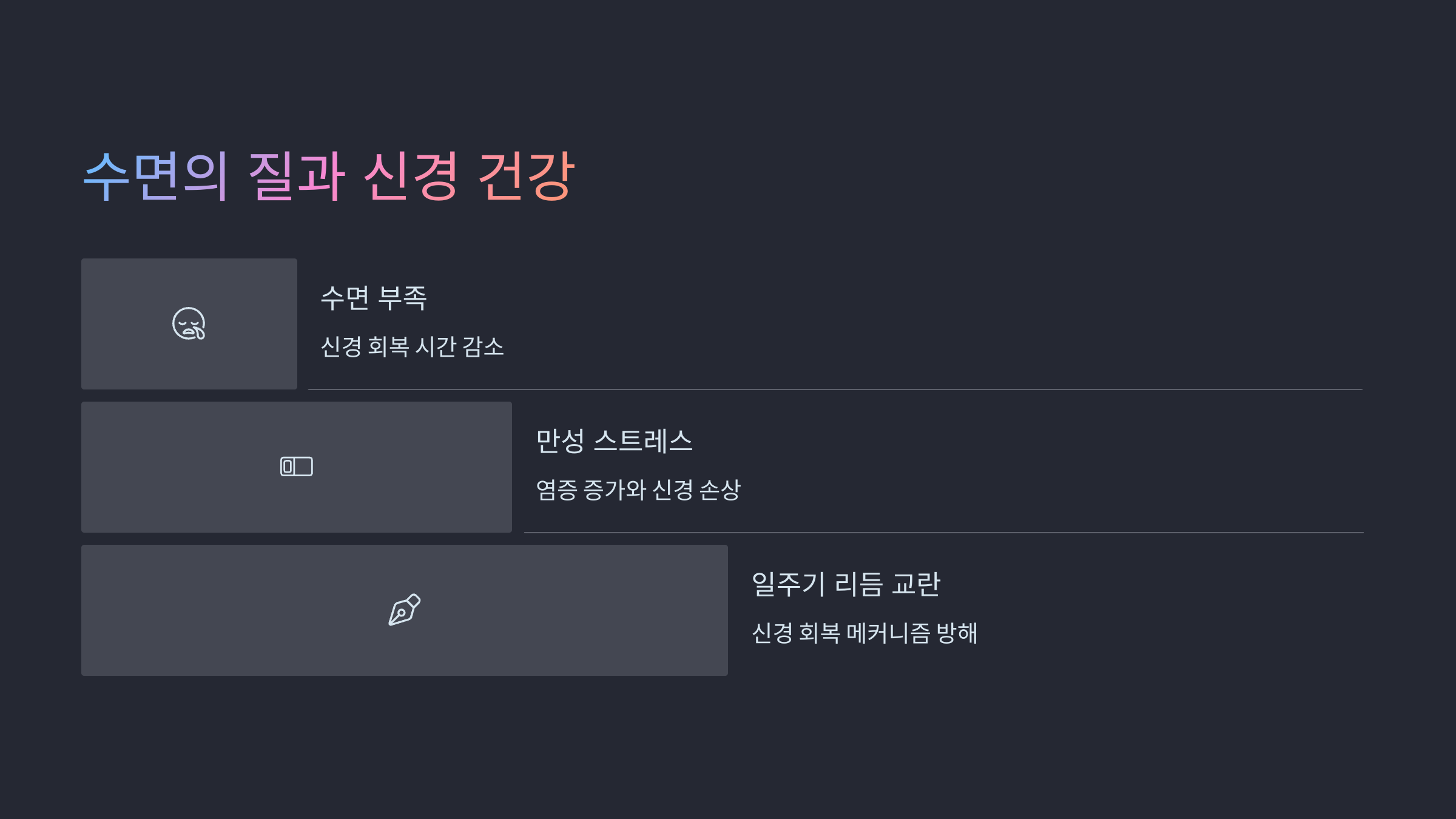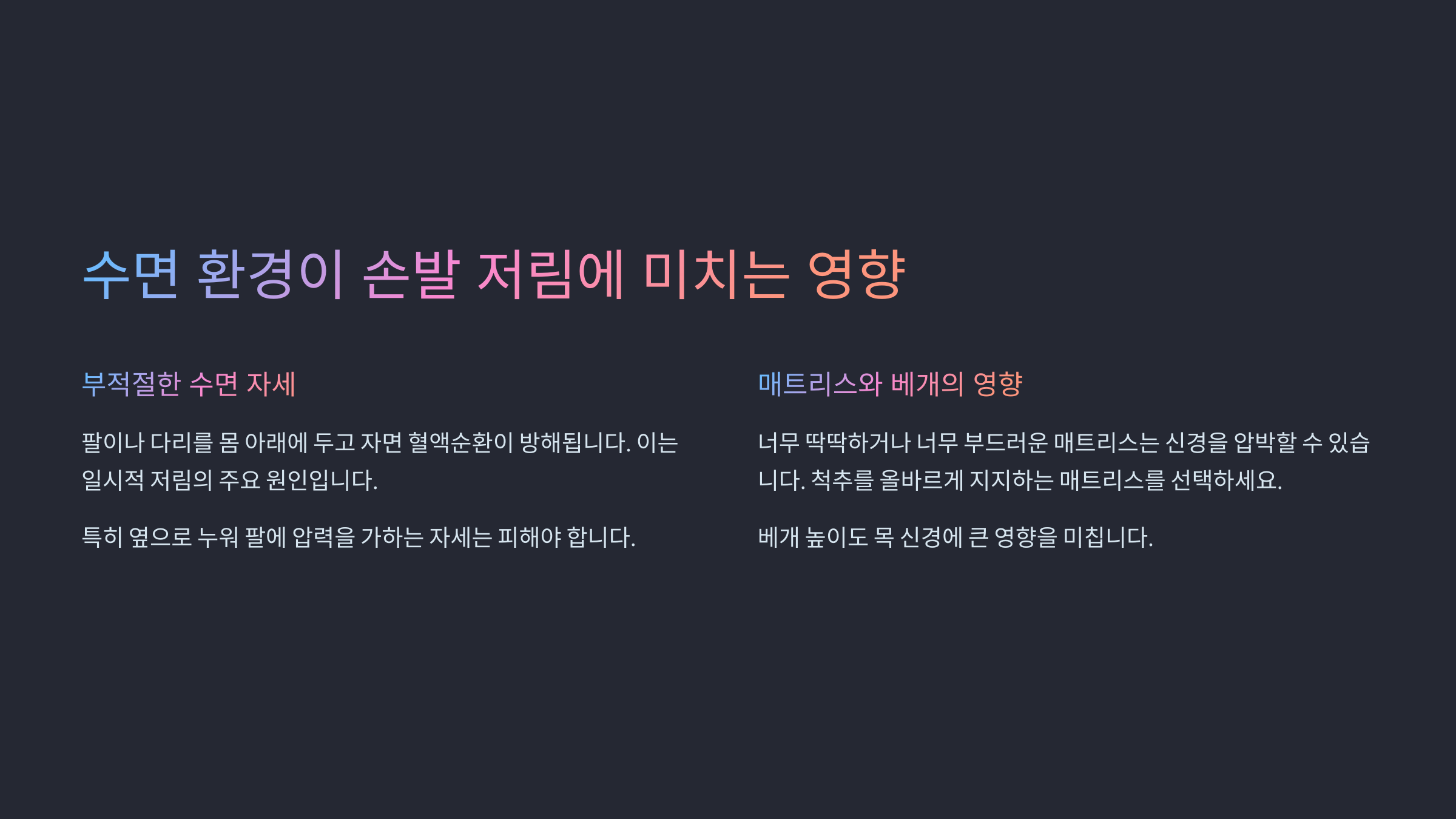 | 얕은 수면 | 신경 회복 저하, 저림 증가 | 피로, 집중력 저하 |