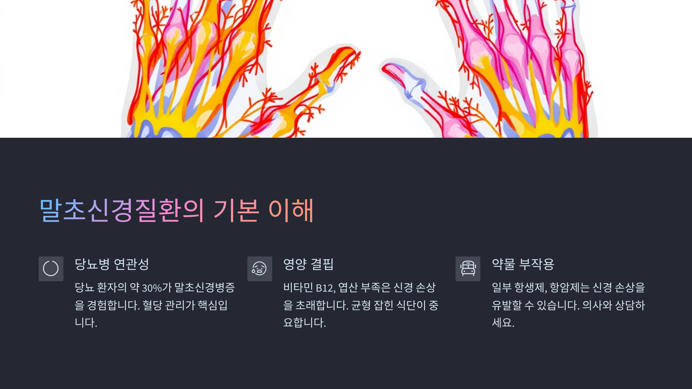 또한 당뇨병은 인슐린 호르몬의 불균형으로 말초신경에 손상을 일으켜 ‘당뇨병성 신경병증’을 일으켜요. 이 질환은 자각 없이 진행되는 경우가 많고, 특히 야간에 통증이나 저림 증상이 심해지는 특징이 있어요.