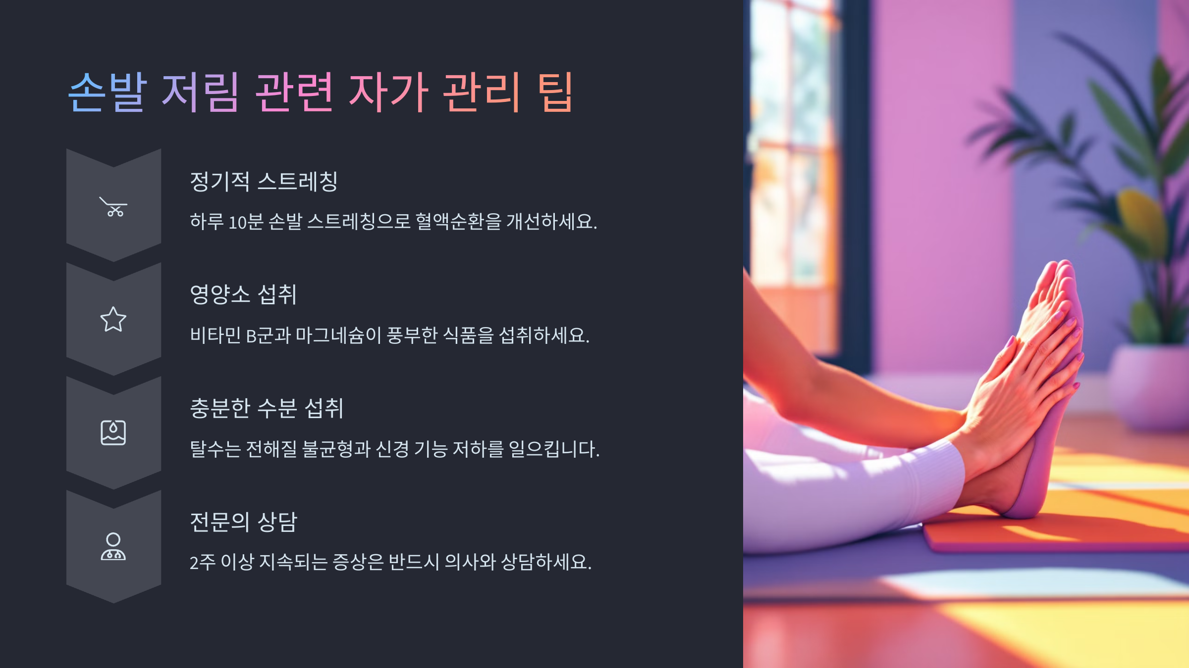 몸이 보내는 작은 신호들을 무시하지 말고, 주기적인 저림이 있다면 건강의 경고음으로 받아들이는 게 좋아요. 특히 밤에 자주 반복된다면 무조건 전문가 상담을 받아보는 걸 추천해요!