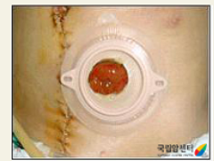 ![]() ① 거즈로 주변 피부를 깨끗이 닦고 피부를 말린다. ![]() ② 장루 크기보다 2~3cm 정도 크게 피부 보호판을 자른다. ![]() ③ 피부 보호판에 붙어있는 종이를 부위부터 떼어낸다. ![]() ④ 피부 보호판을 장루에 인접된 누르면서 부착시킨다. ![]() ⑤ 클립으로 주머니 끝을 끼운다. ![]() ⑥ 부착된 피부 보호판에 주머니를 끼운다. |