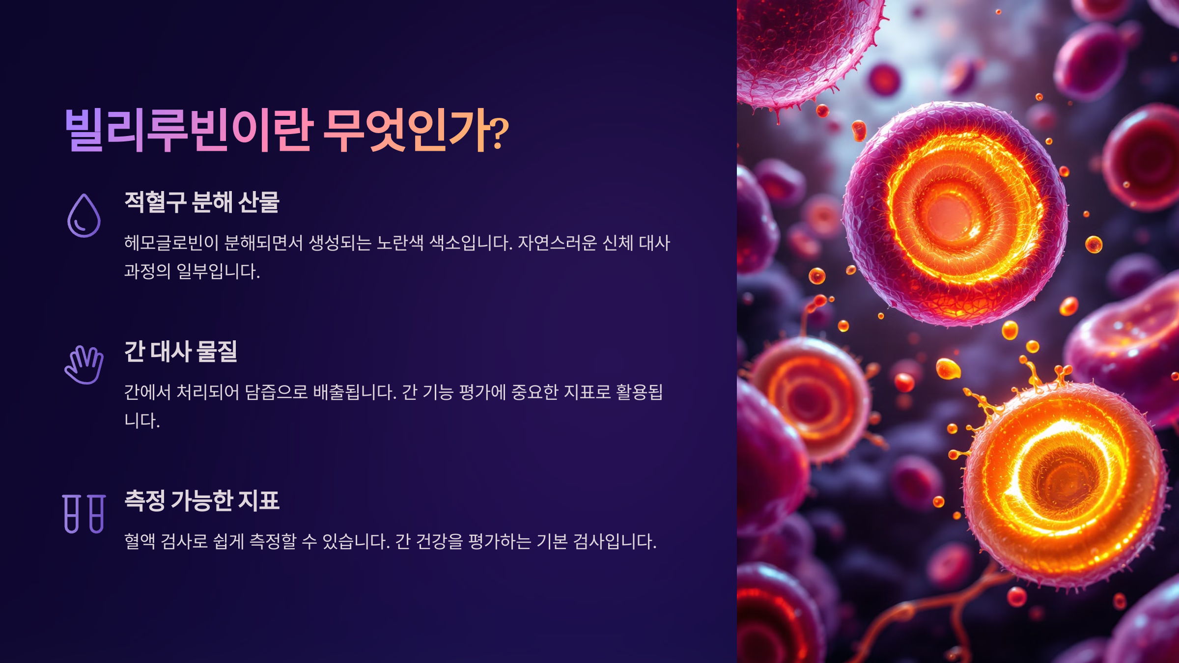 빌리루빈은 적혈구가 수명을 다해 분해되면서 생성되는 노란색 색소예요. 간에서 처리되어 담즙으로 배출되기 때문에, 간 기능과 매우 밀접한 관련이 있어요. 이 물질은 피 속을 돌다가 간으로 운반되고, 다시 소화기관으로 배출되는 과정을 거쳐요. 그래서 간에 문제가 생기면 이 경로가 막히고, 수치가 올라가게 되는 거랍니다.