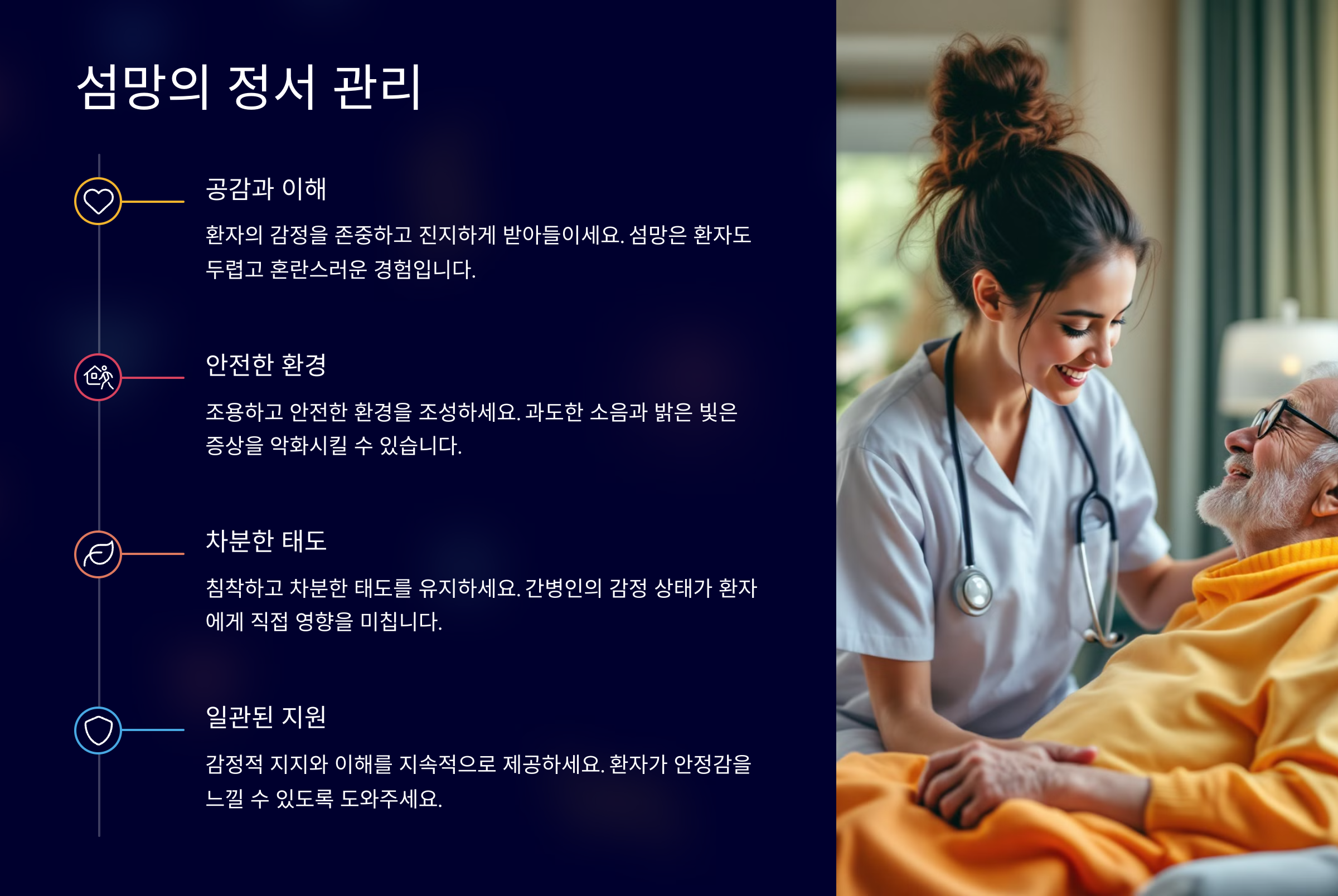 섬망 환자의 정서를 돌본다는 건 단순한 위로나 말 몇 마디로 끝나는 게 아니에요. 환자는 혼란스러운 현실 속에서 감정적으로도 매우 불안하고 고립감을 느끼기 쉬워요. 이럴 땐 ‘감정적 동행자’가 되어주는 게 가장 중요하답니다.