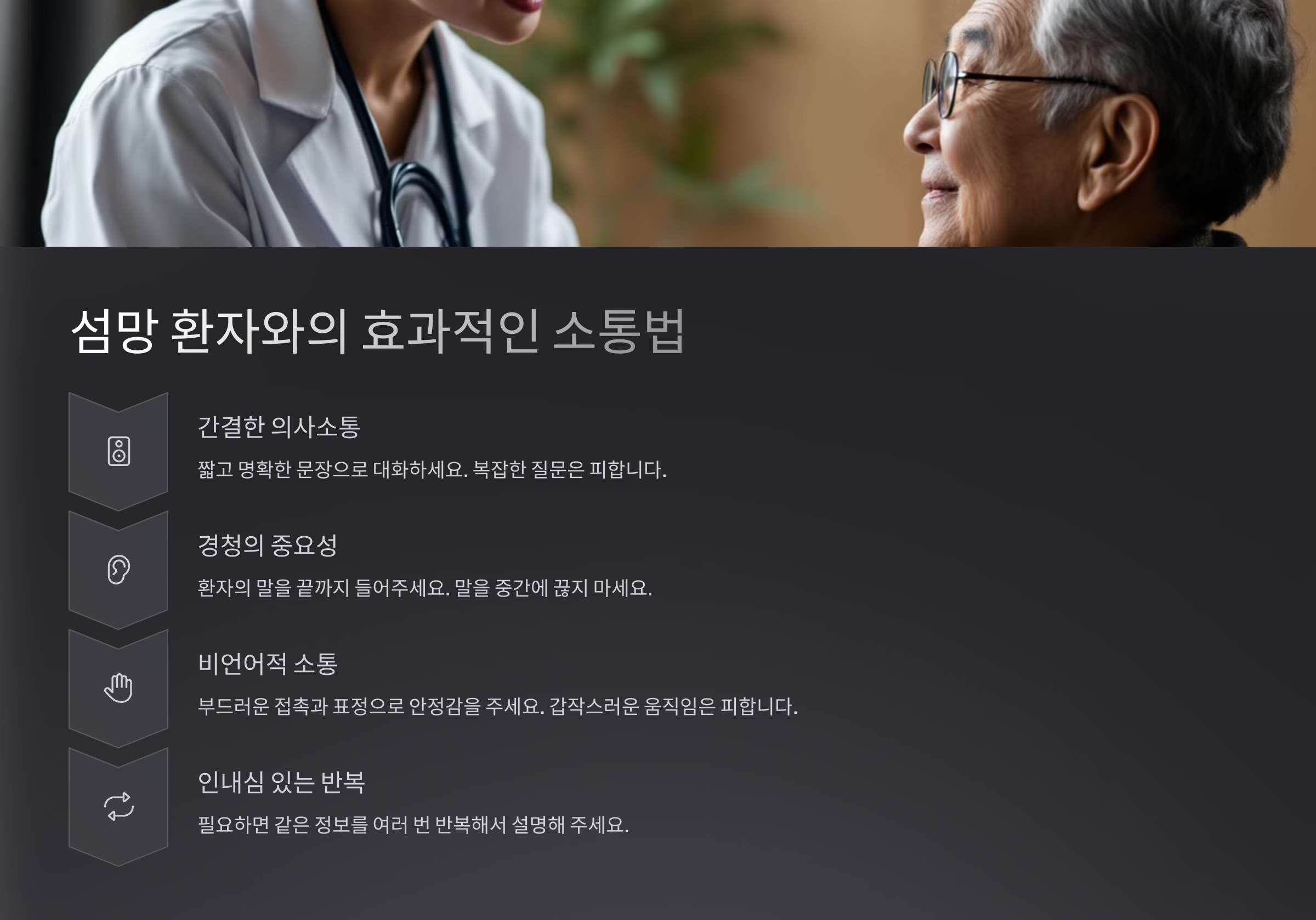 섬망 환자와 대화할 때 가장 중요한 건 ‘현실을 강요하지 않는 것’이에요. 환자는 지금 자신만의 현실 속에 있어요. 그걸 억지로 깨뜨리려고 하면 오히려 더 혼란스럽고 불안해져요. 소통의 목적은 ‘설득’이 아니라 ‘안정감 주기’라는 걸 기억해야 해요.