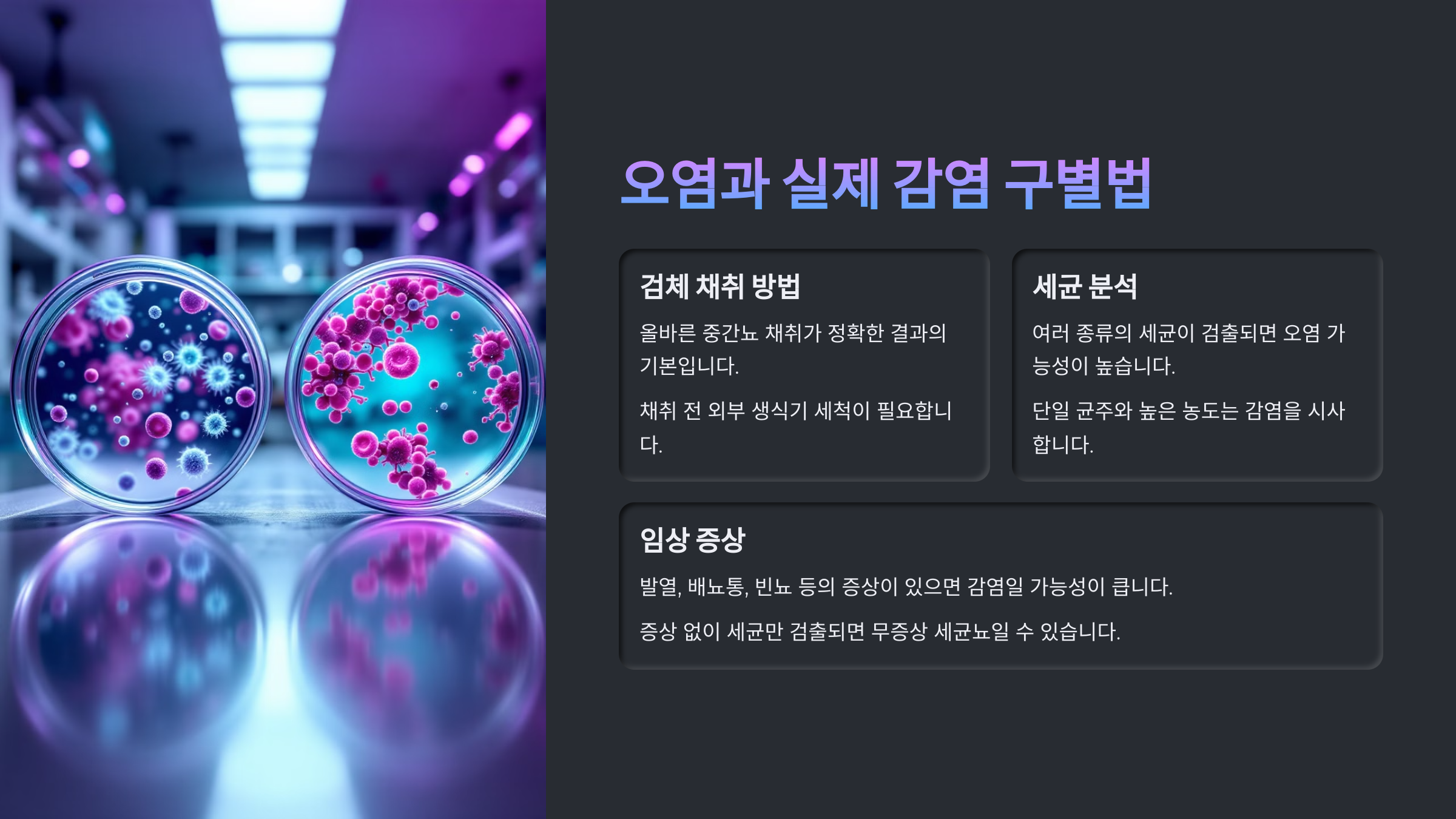 반대로 하나의 균이 다량으로 검출되고, 증상도 있다면 감염 가능성이 높다고 봐요. 특히 배뇨 시 통증, 빈뇨, 하복부 통증 등이 있다면 거의 감염으로 간주해요. 이때는 빠르게 항생제를 시작해야 해요.