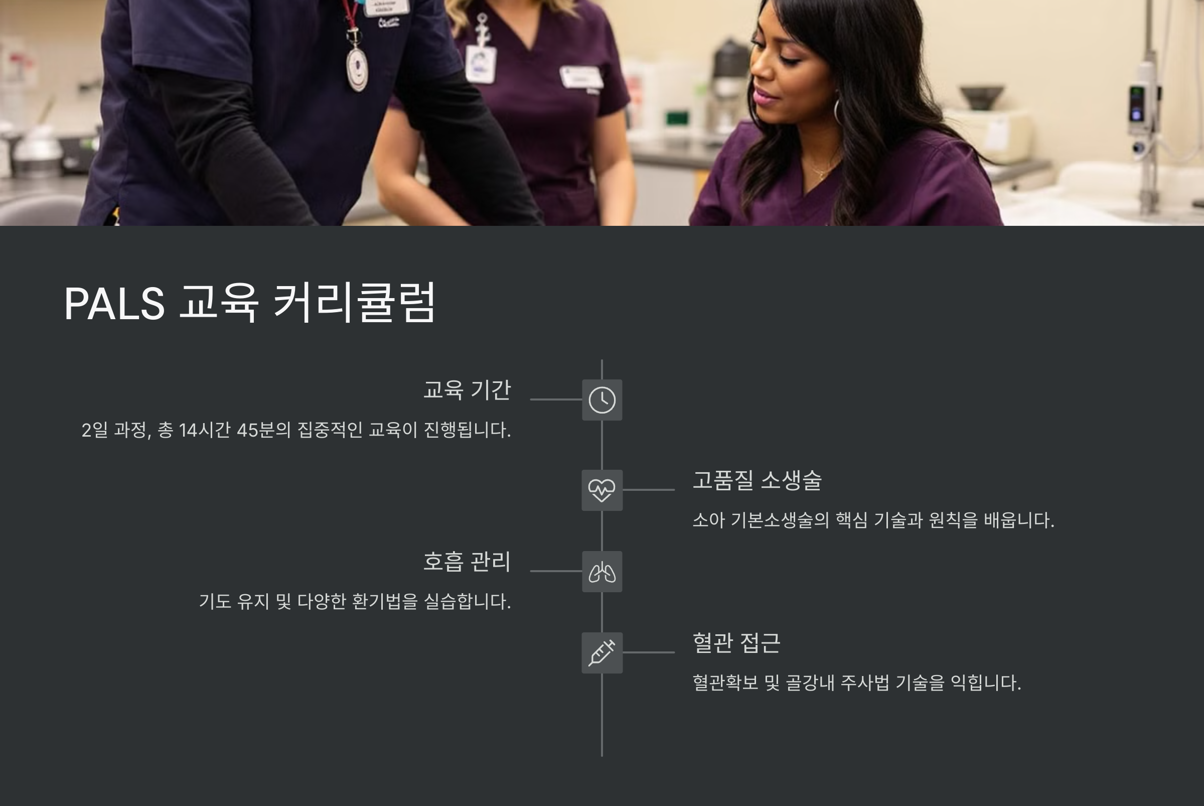 소아의 생명을 지키는 건 빠른 판단력과 팀워크, 그리고 평소의 훈련이에요. 그 모든 것이 PALS 안에 담겨 있답니다. 다음은 어떤 내용을 배울 수 있는지 커리큘럼을 볼 차례예요! 📘