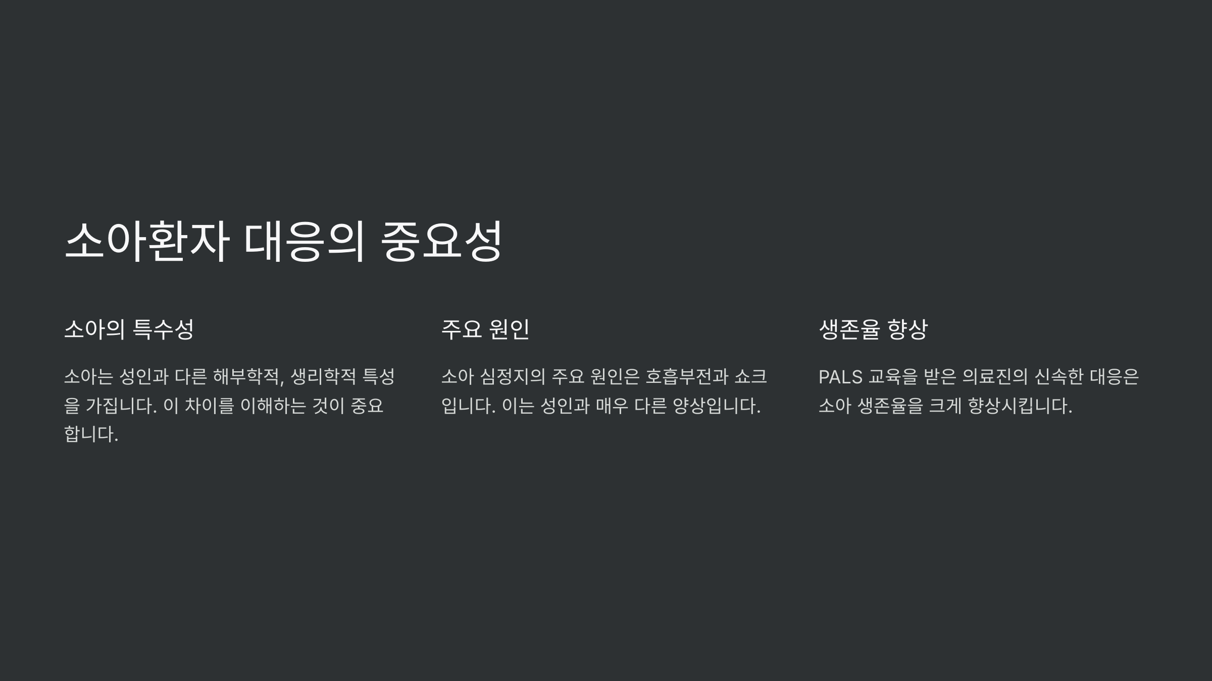 또한 아이들은 의사표현이 미숙하고 증상을 정확히 전달하지 못하는 경우가 많아서, 병세가 급격히 악화되기도 해요. 그래서 의료진이 빠르게 임상 징후를 관찰하고, 체계적인 응급 대응을 할 수 있어야 해요.