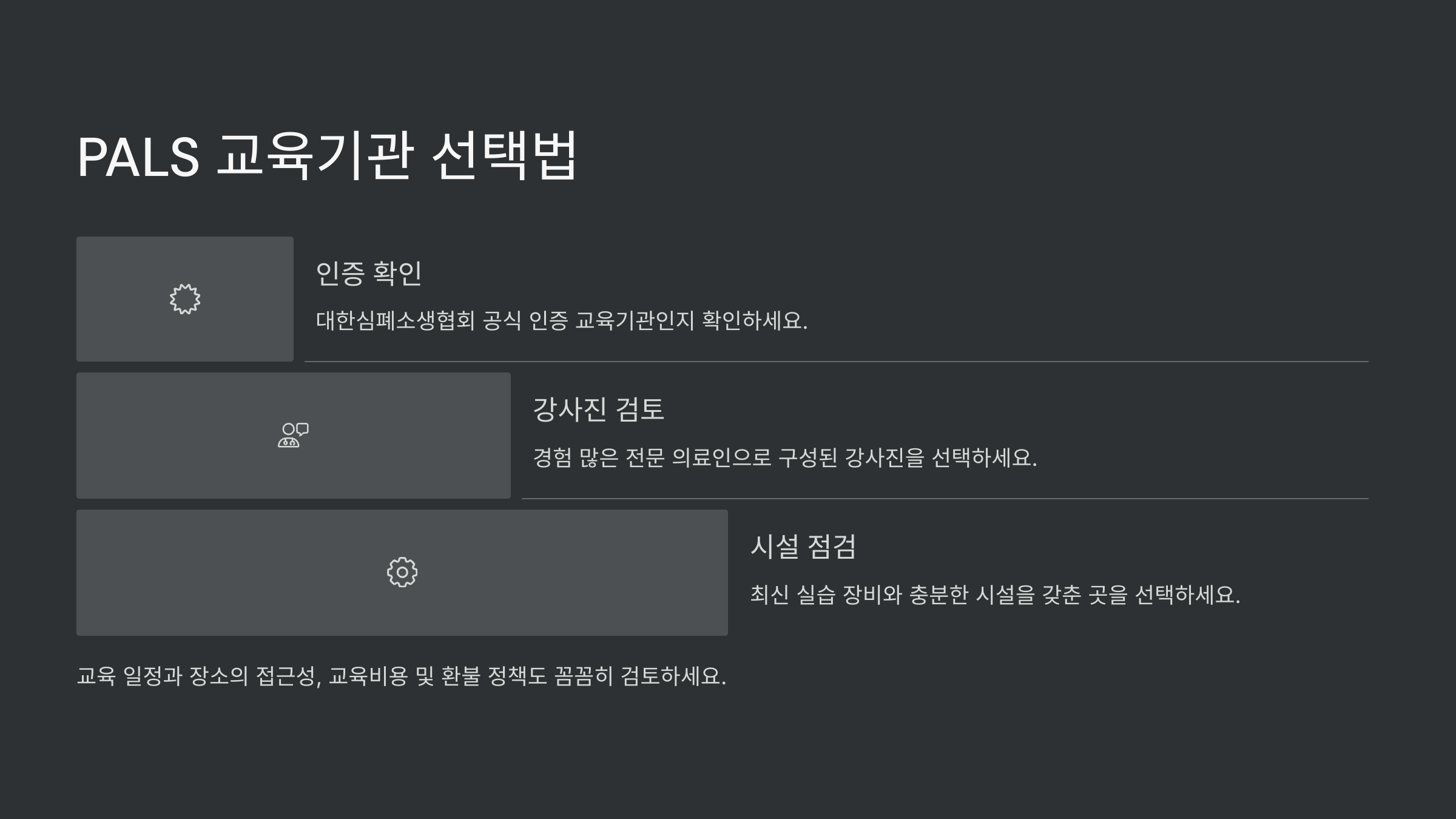 가장 먼저 확인할 건 해당 기관이 AHA(미국심장협회) 또는 KACPR(대한심폐소생협회) 공인 센터인지예요. 공인기관만이 국제 인증이 가능한 공식 PALS 수료증을 발급할 수 있어요. 비공인 기관은 싸더라도 인정받지 못하니 주의해야 해요.