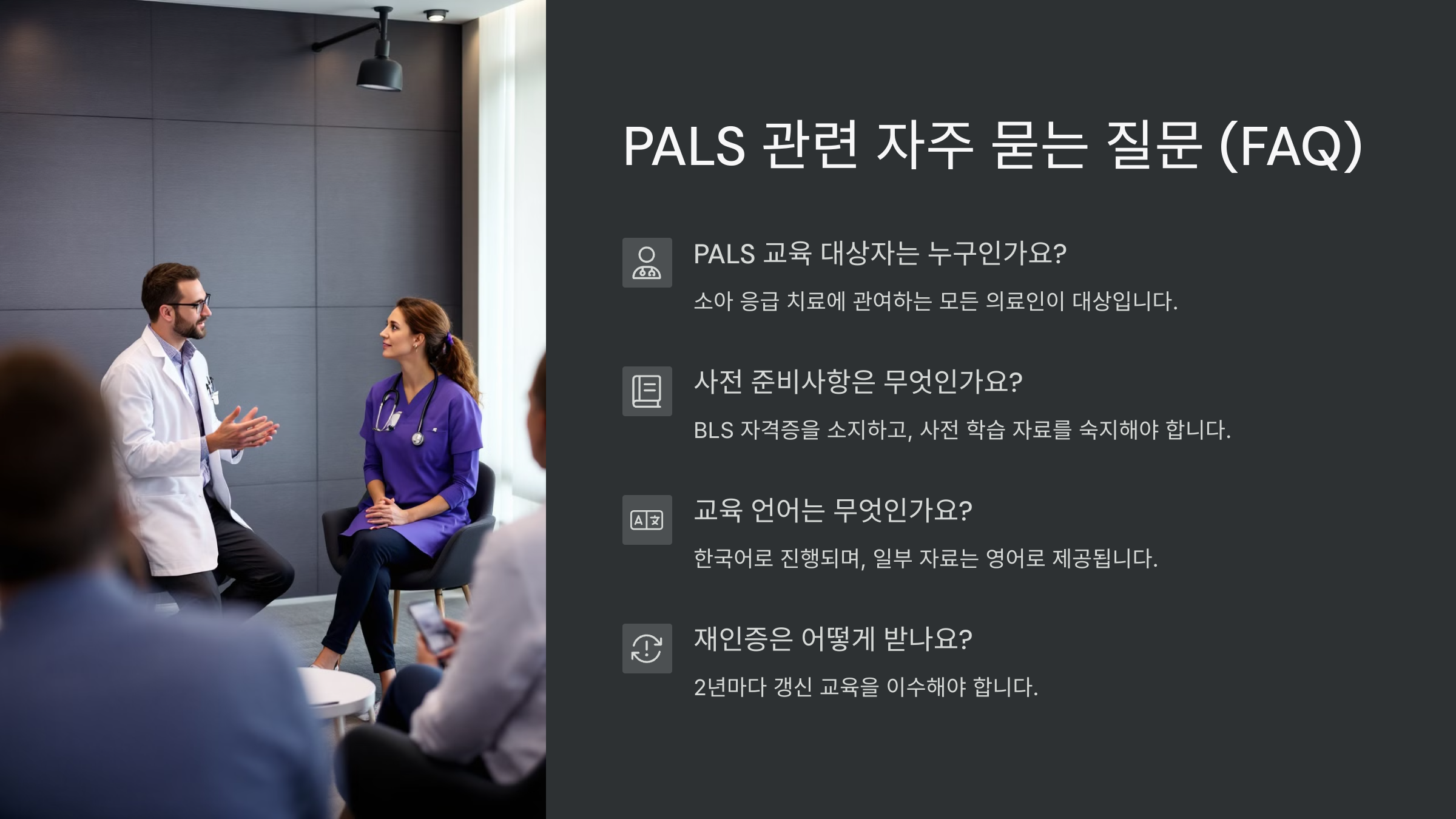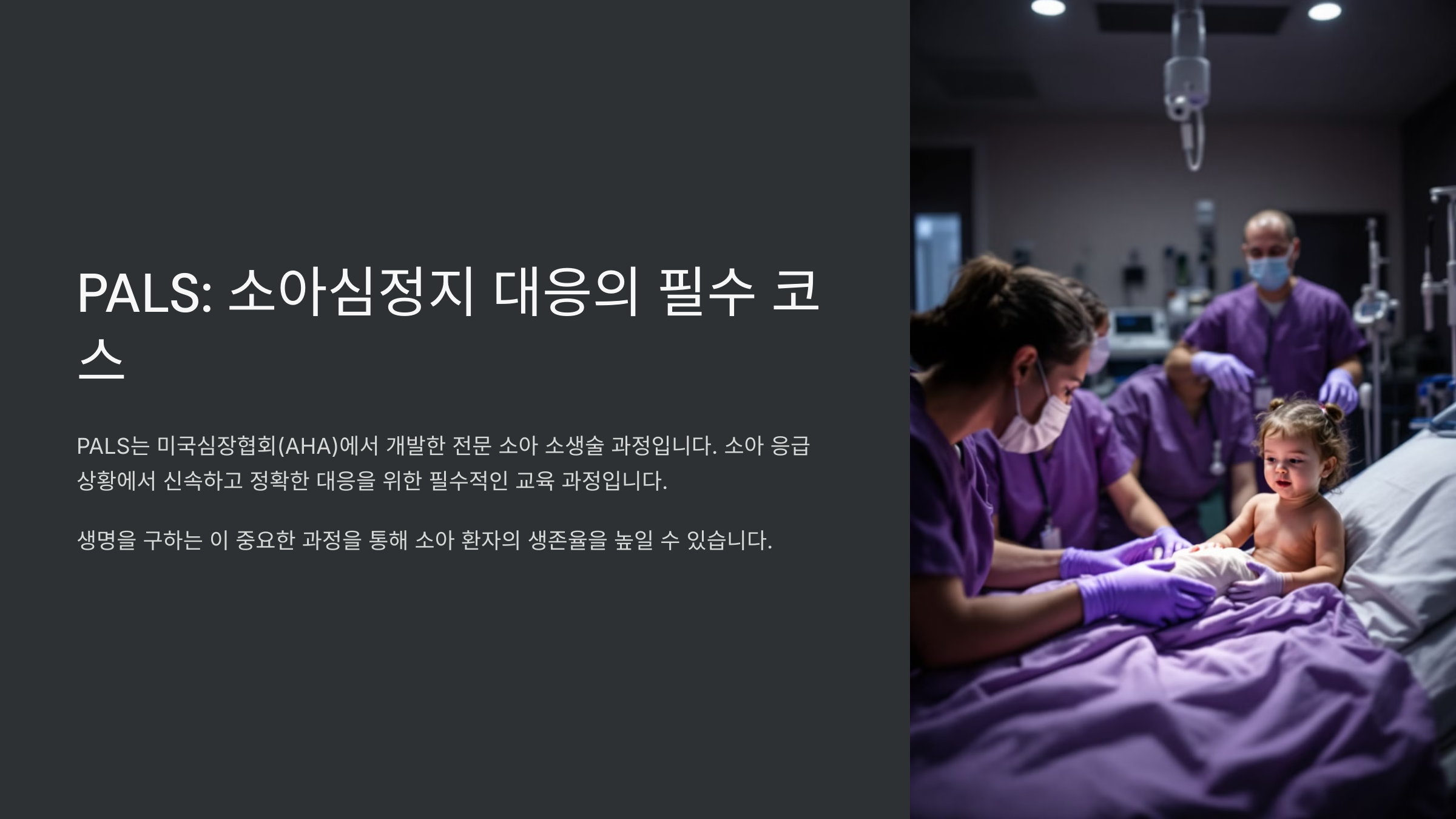 특히 의료인이 아니어도 소아 관련 직군이라면 큰 도움이 되는 내용이 많으니, PALS가 왜 필수인지 지금부터 함께 알아보도록 해요!