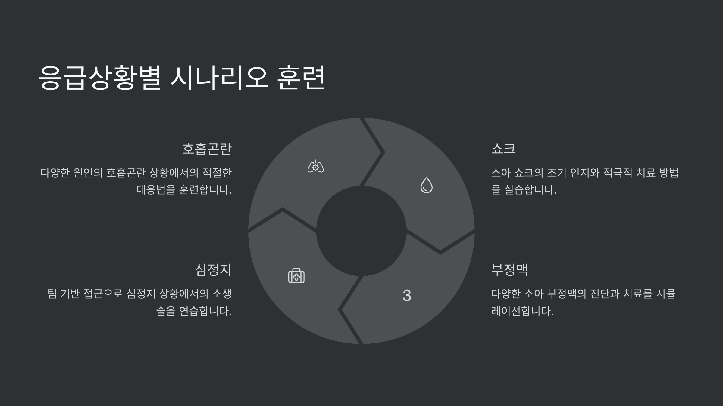 이 커리큘럼은 소아 응급에 대한 자신감을 심어주고, 실제 상황에서 당황하지 않고 움직일 수 있는 힘을 길러줘요. 다음 섹션에서는 이런 실습이 어떻게 응급 시나리오로 연결되는지 알려줄게요!