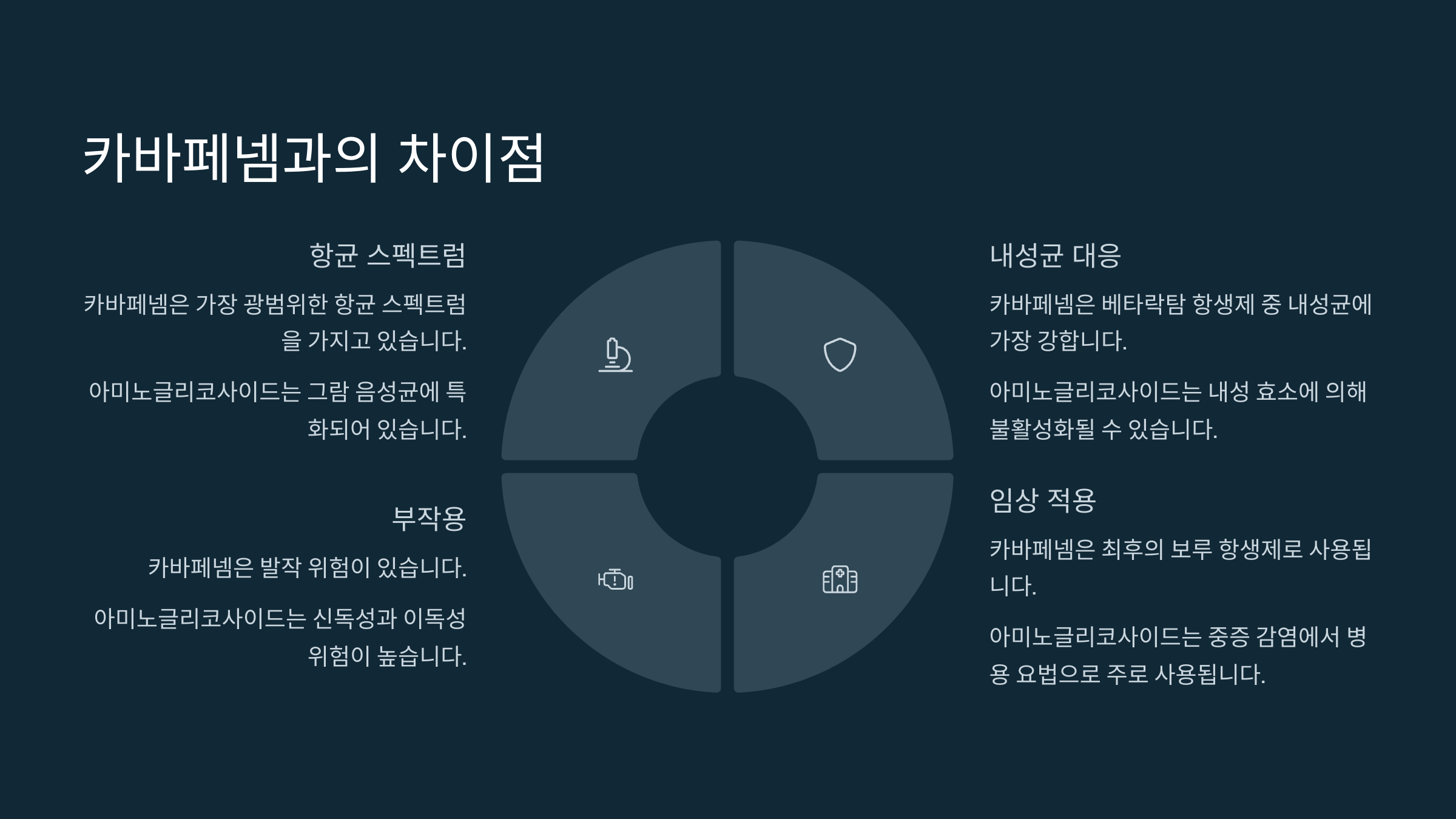 | 내성 대응력 | 높음 | 내성균 일부에 효과 |