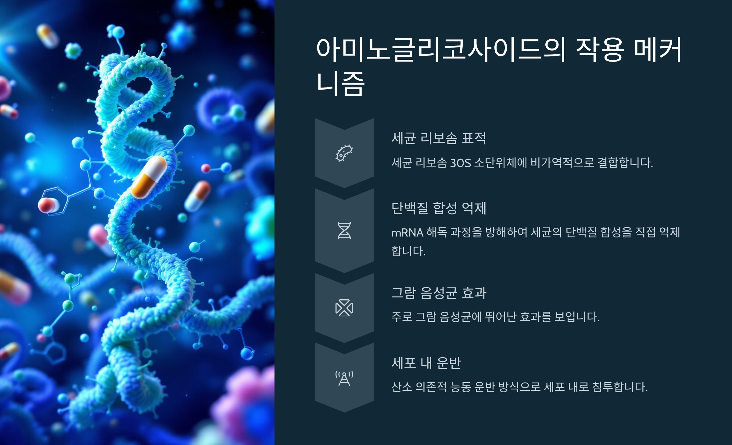이 항생제의 구조는 아미노당과 글리코사이드 결합으로 되어 있어요. 이 독특한 구조 덕분에 세균의 리보솜 30S 소단위에 결합해 단백질 합성을 저해하죠. 결과적으로 세균의 성장을 멈추고 사멸에 이르게 해요.