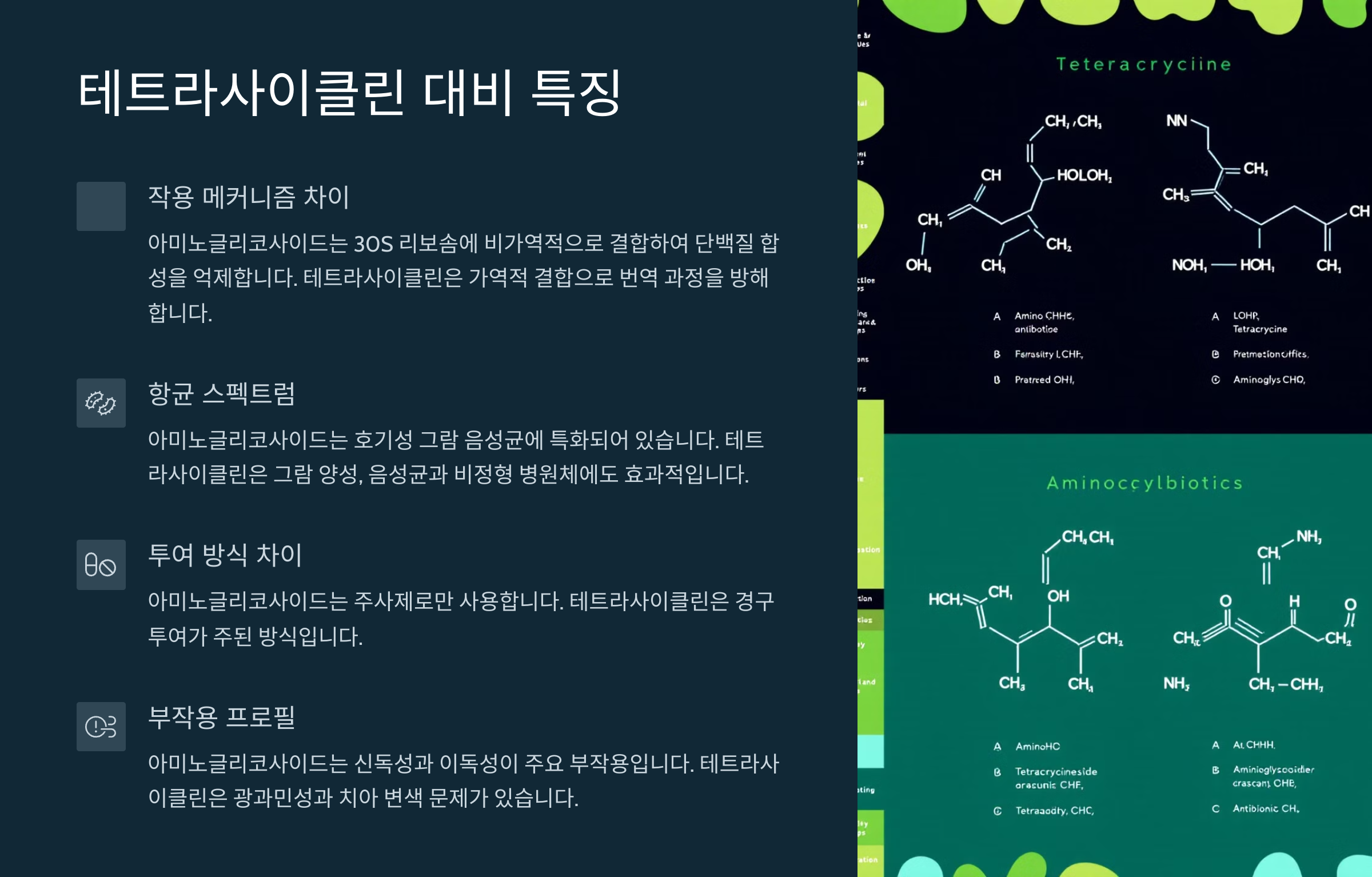 🔬 테트라사이클린 vs 아미노글리코사이드 비교표