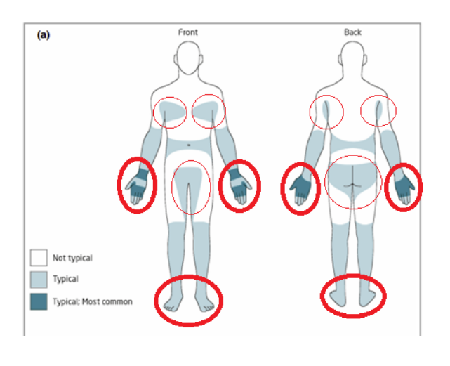 3. 호발부위 : 손가락 사이, 손목의 굴절부위, 남성 성기 주변, 팔꿈치 ,발바닥, 발등, 둔부, 액와부에서 발견