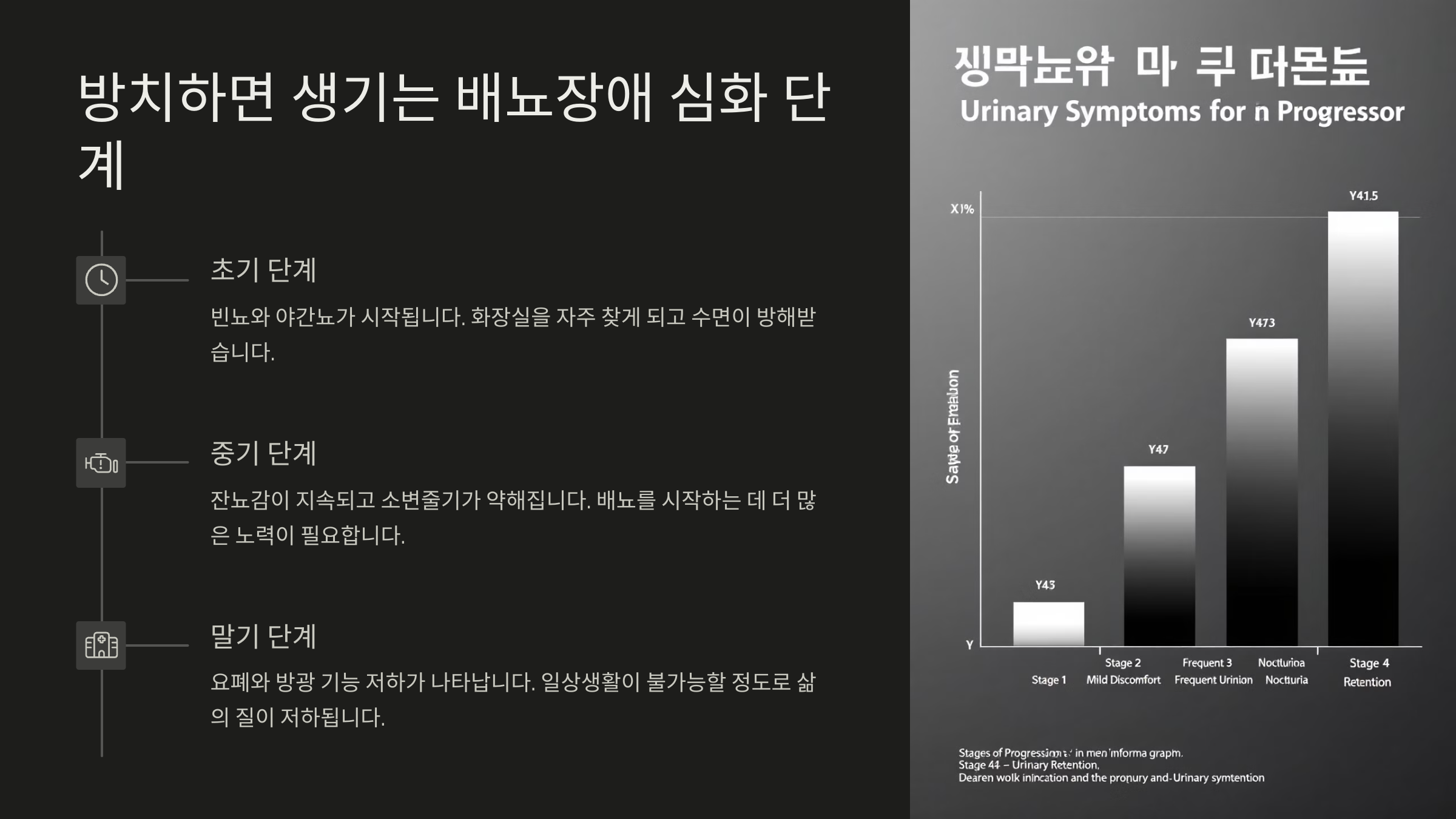 전립선 비대증이 단순한 노화 현상이라고 생각하면 큰 오산이에요. 초기에는 생활습관 개선만으로도 큰 효과를 볼 수 있지만, 무시하고 방치하면 질환은 빠르게 진행된다는 사실, 꼭 기억해 주세요!