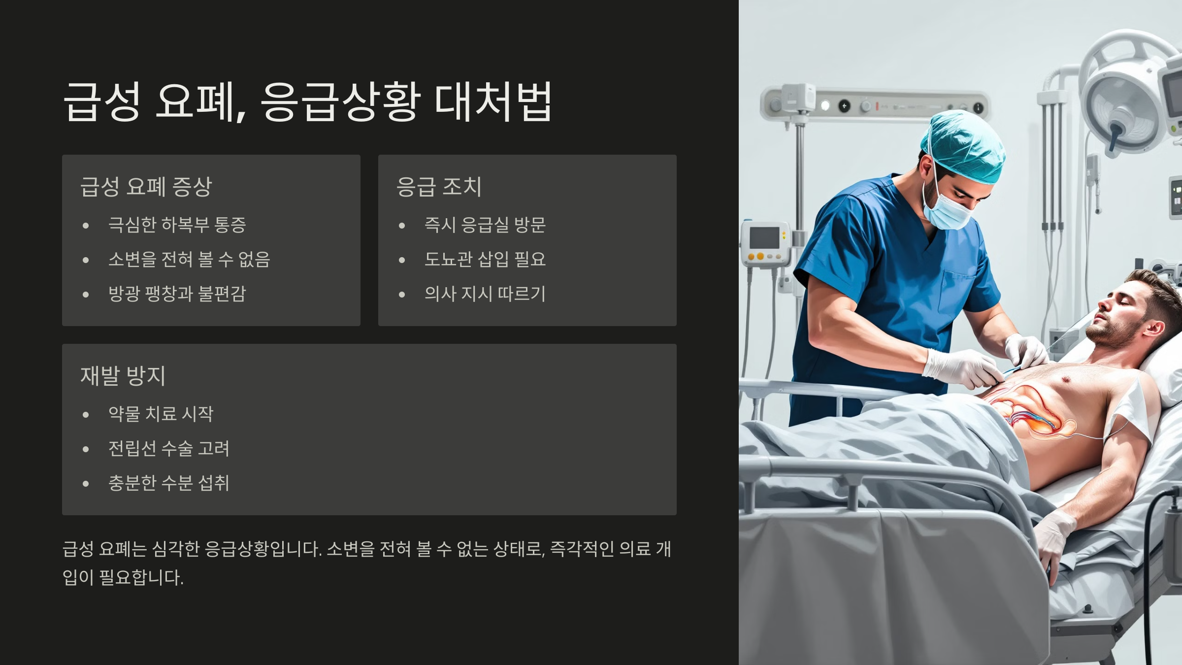 급성 요폐는 응급실에서 카테터(요도 관)을 삽입하여 즉시 소변을 배출하는 방식으로 치료해요. 하지만 이런 처치는 일시적인 해결책일 뿐, 근본적인 문제를 해결하려면 전립선 비대증 치료를 받아야 해요.