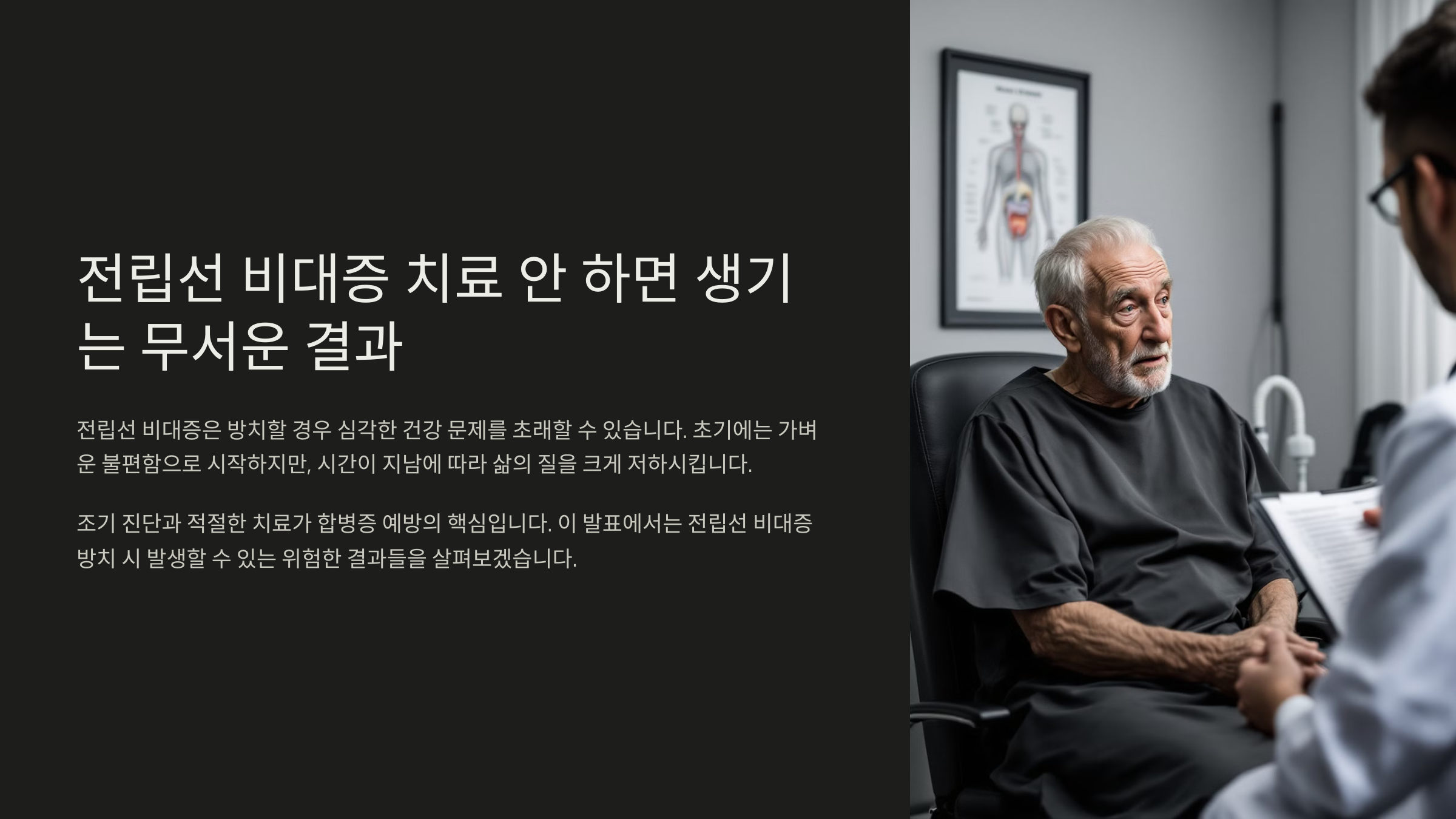 전립선 비대증이 단순한 노화 현상이라고 생각하면 큰 오산이에요. 초기에는 생활습관 개선만으로도 큰 효과를 볼 수 있지만, 무시하고 방치하면 질환은 빠르게 진행된다는 사실, 꼭 기억해 주세요!