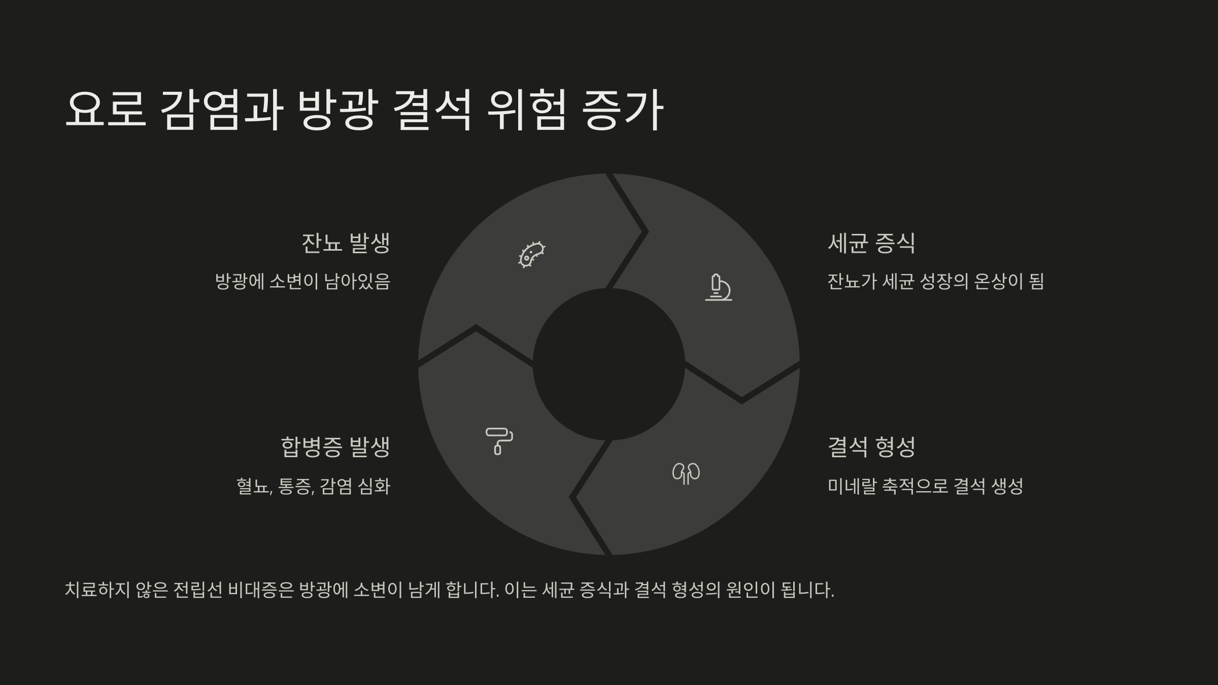 방광에 남아 있는 소변은 시간이 지나면서 농축되어 방광 결석을 형성할 수도 있어요. 방광 결석은 배뇨 시 심한 통증을 유발하며, 돌이 커지면 소변 배출이 더욱 어려워질 수도 있어요.