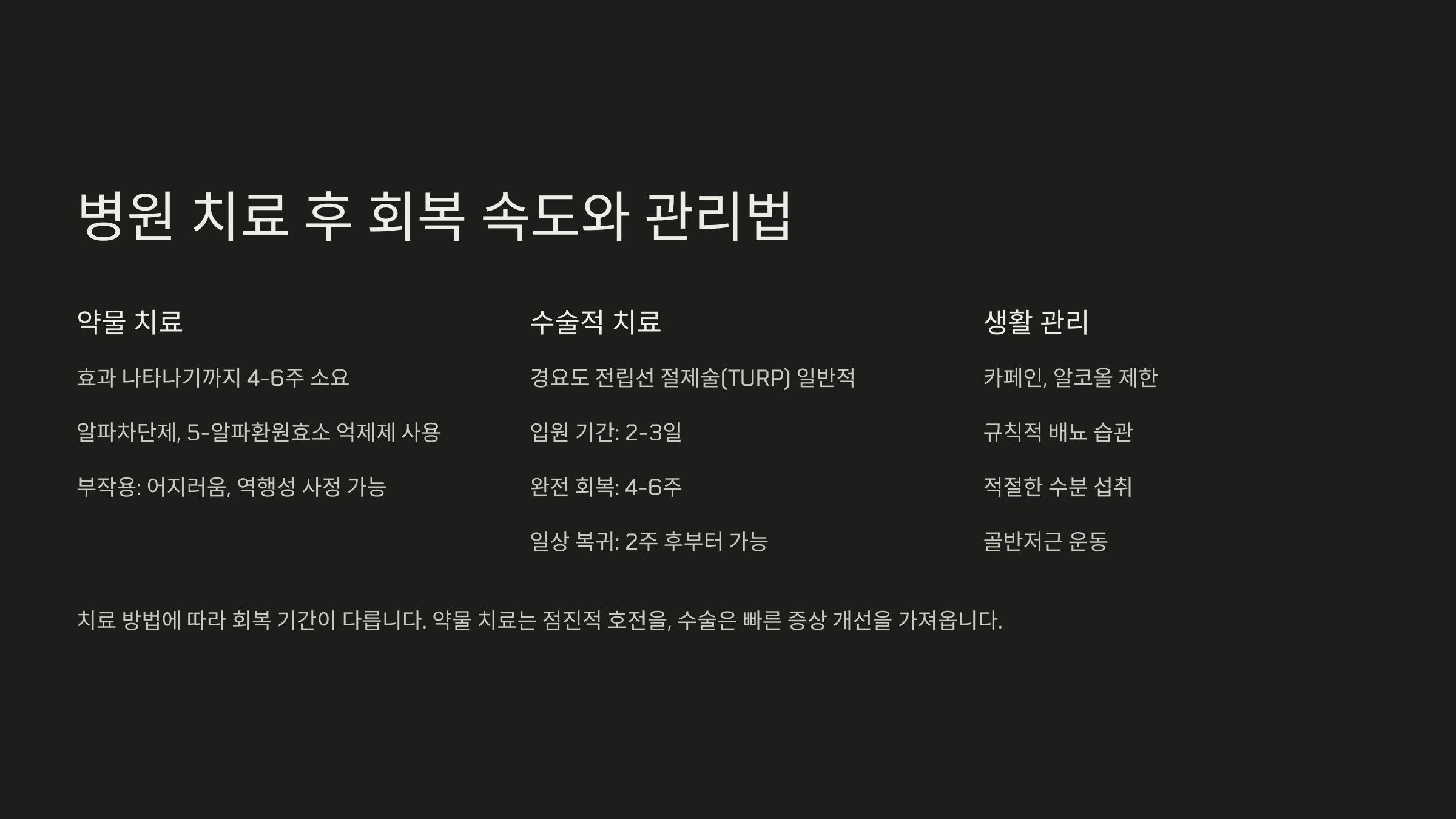 전립선 비대증 치료를 받으면 증상이 완화되지만, 치료 후에도 올바른 관리가 필요해요. 회복 속도는 치료 방법과 개인의 건강 상태에 따라 다르지만, 보통 약물치료는 1~3개월, 수술 후에는 4~6주 정도면 일상생활로 복귀할 수 있어요.