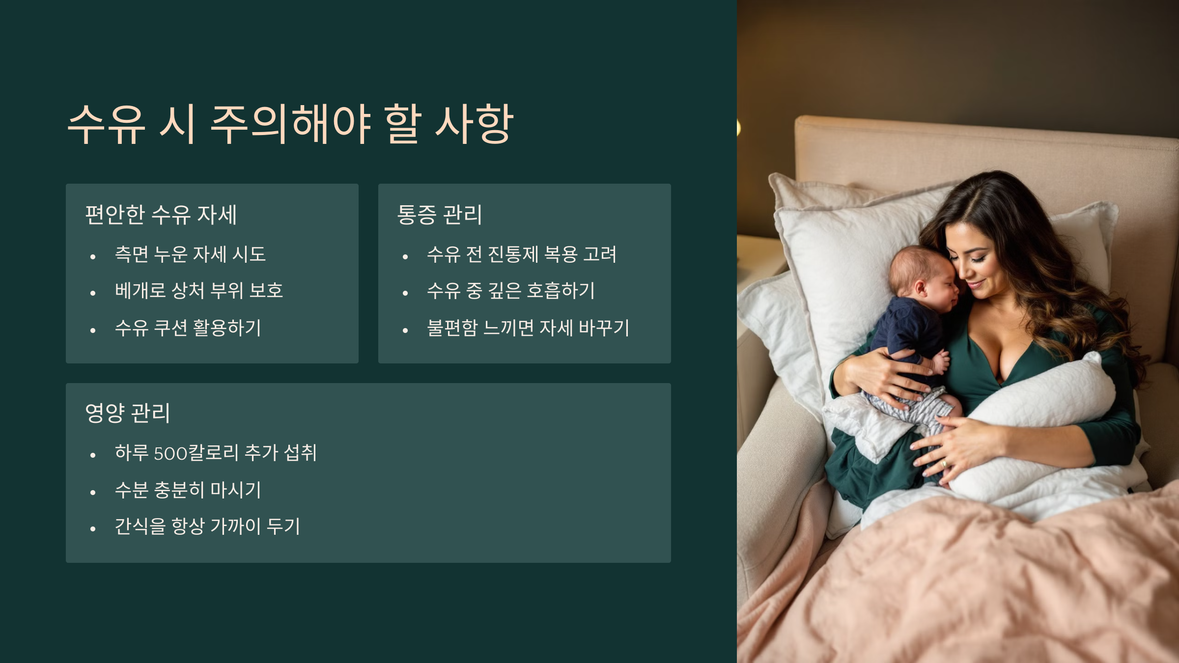 1. 수유 자세 선택 일반적인 수유 자세(앉아서 아기를 안고 먹이는 자세)는 수술 부위에 부담을 줄 수 있어요. 따라서 옆으로 누워서 수유하는 자세를 추천해요.