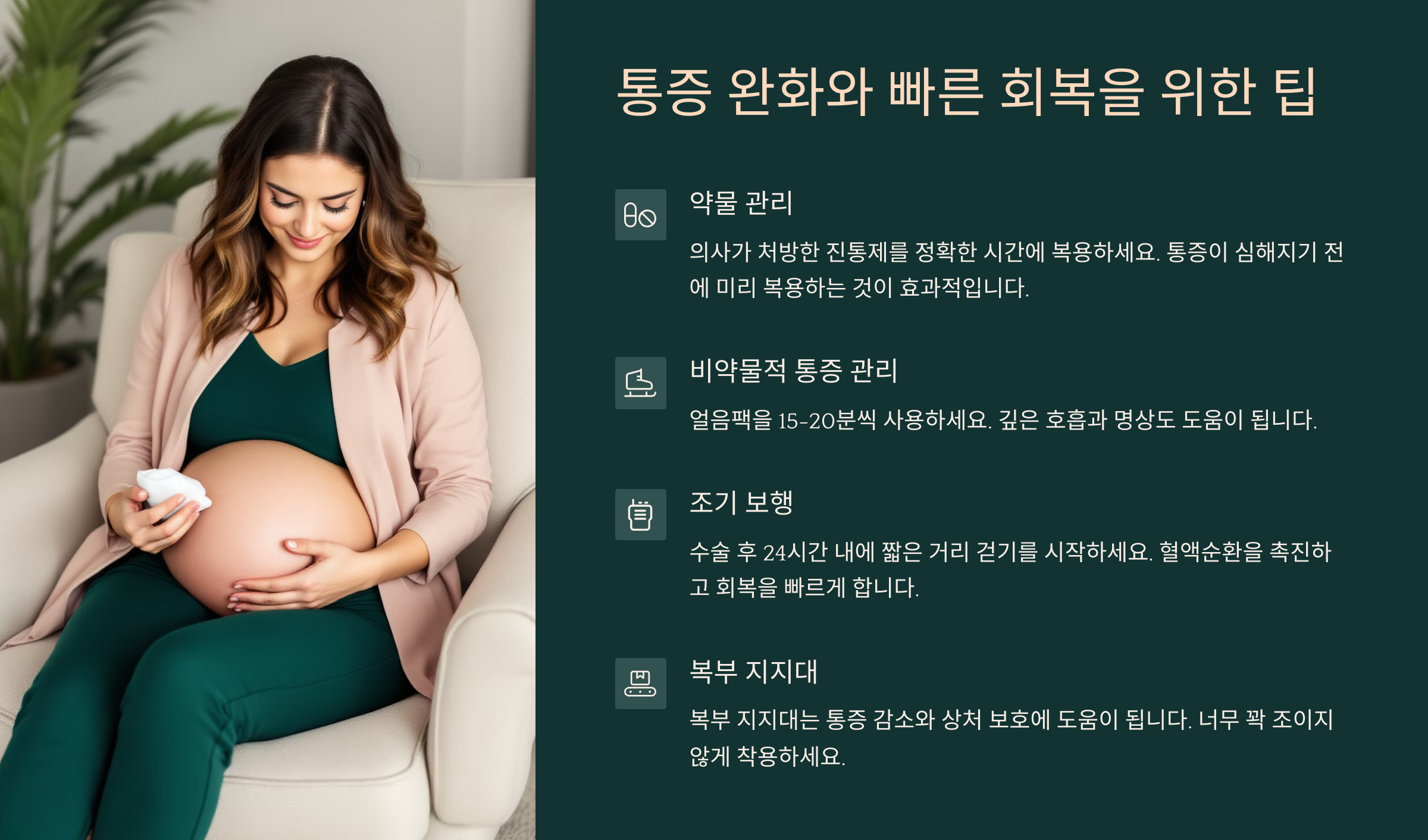 다음으로, 제왕절개 후 통증 완화와 빠른 회복을 위한 팁을 알아볼게요. ⬇️