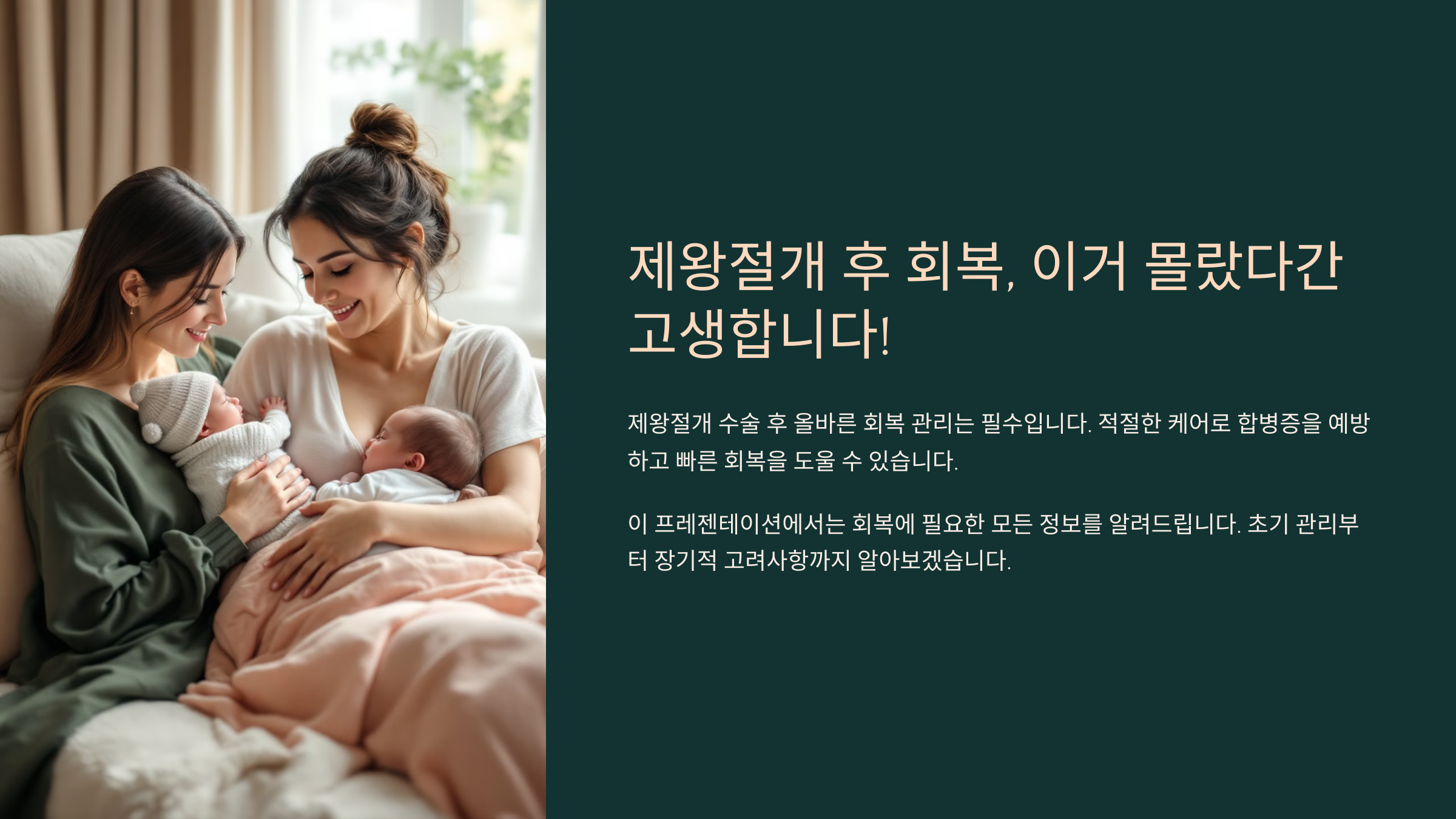 제왕절개 후 회복은 개인차가 크지만, 올바른 관리만 잘하면 빠르게 건강을 되찾을 수 있어요! 😊