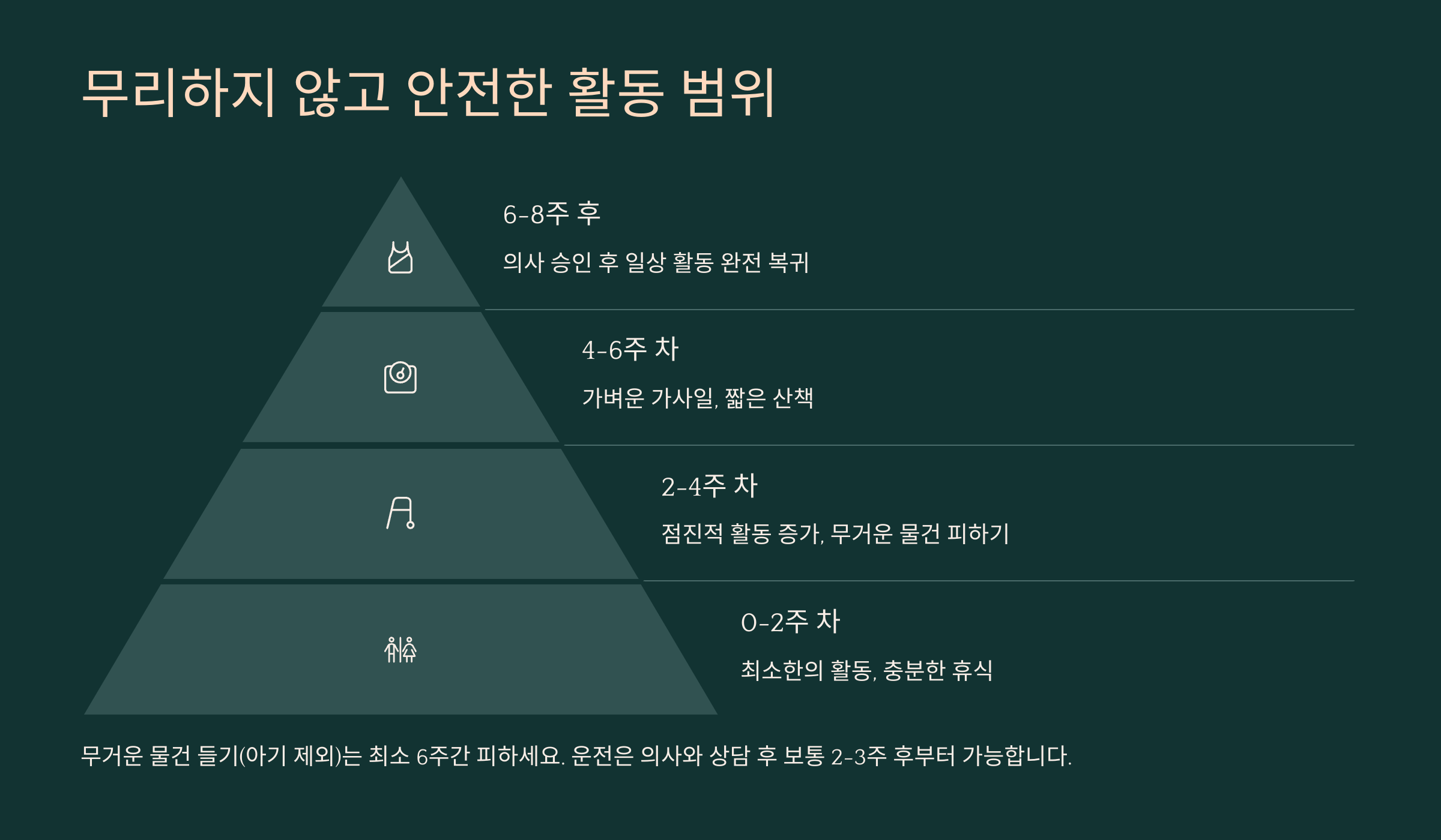 | 3~4주차 | 가벼운 집안일, 아기 돌보기 | 무거운 물건 들기 금지 |