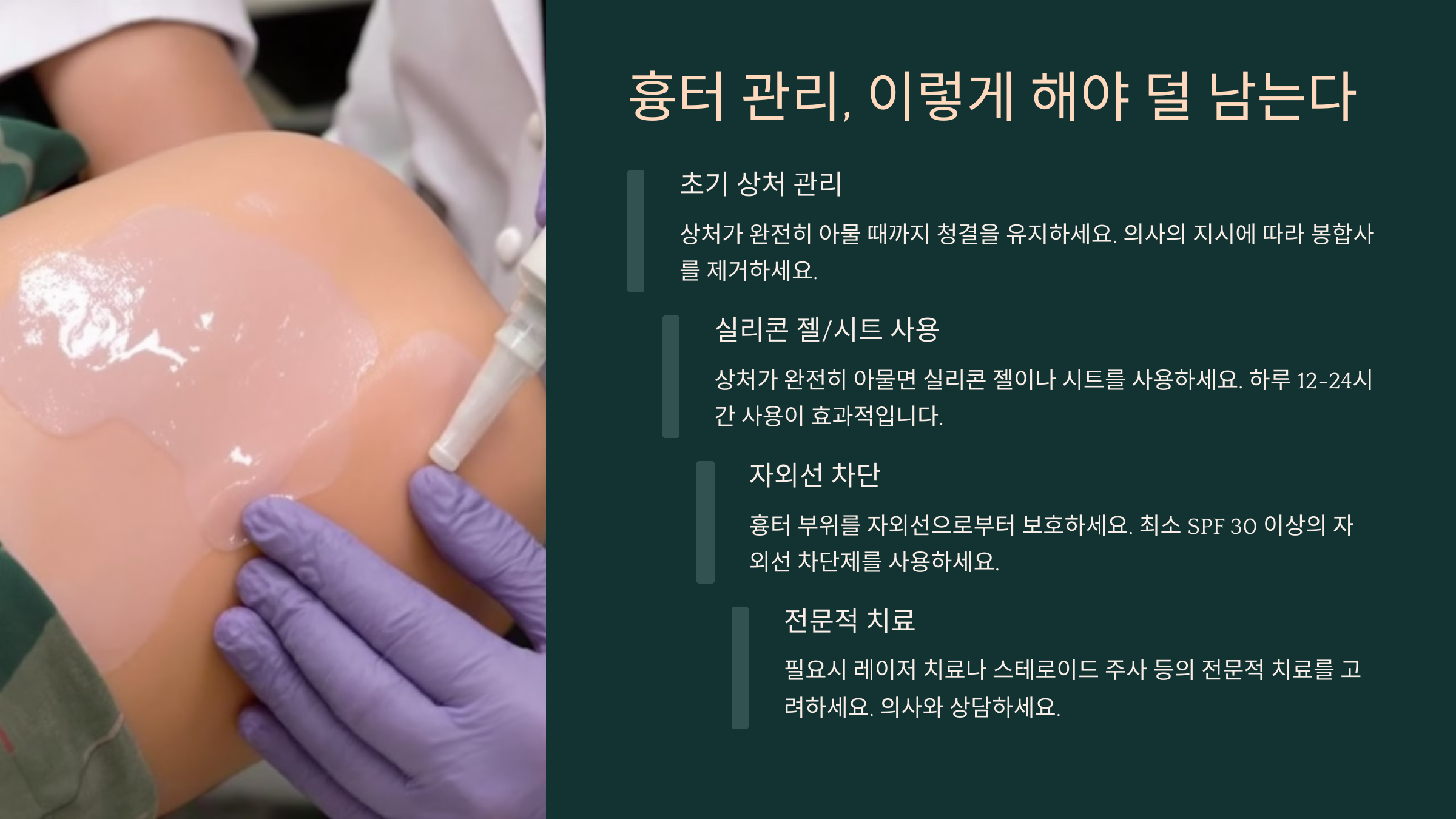 | 자외선 차단 | 햇빛이 닿으면 흉터가 더 짙어질 수 있음 |
