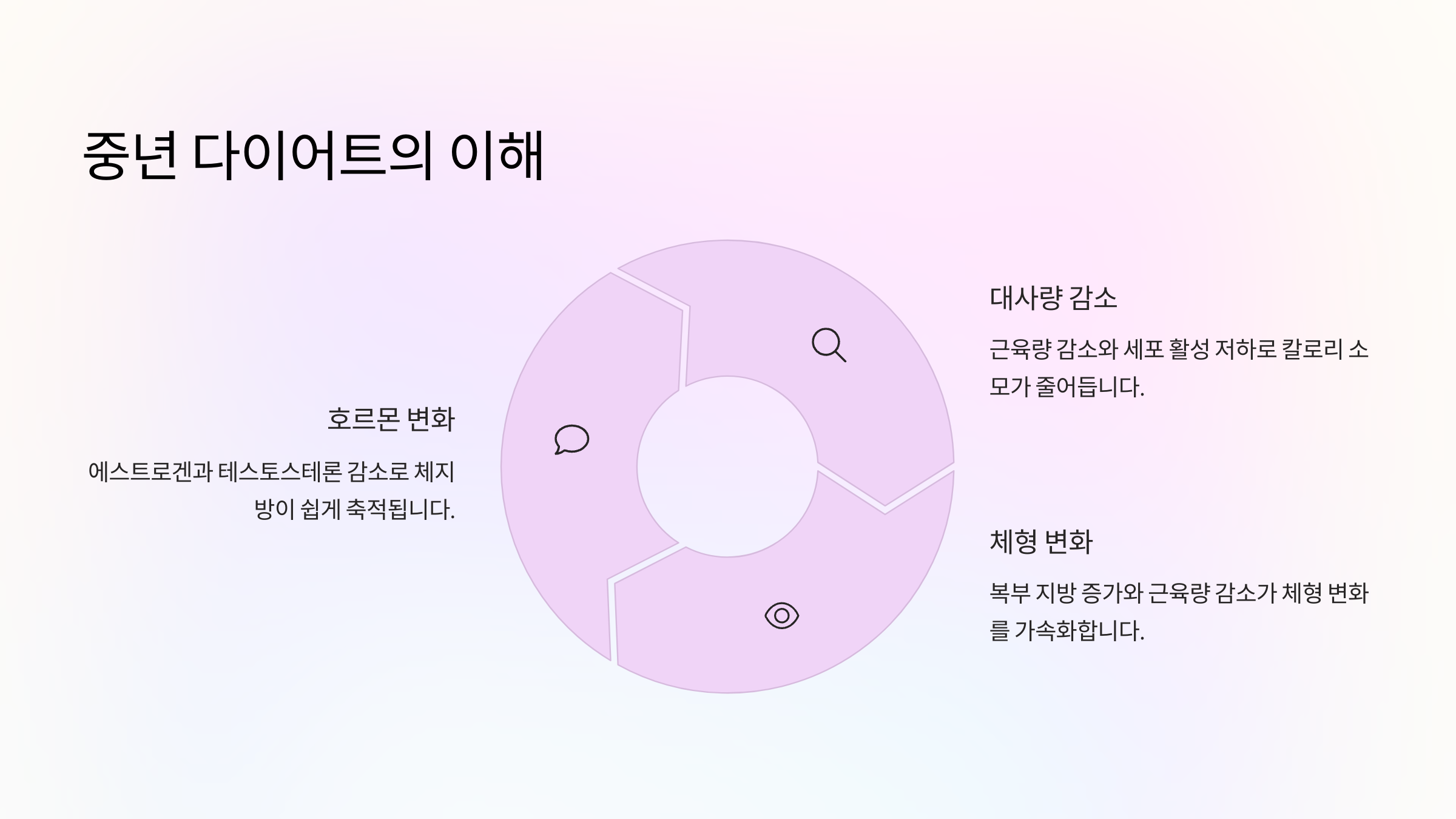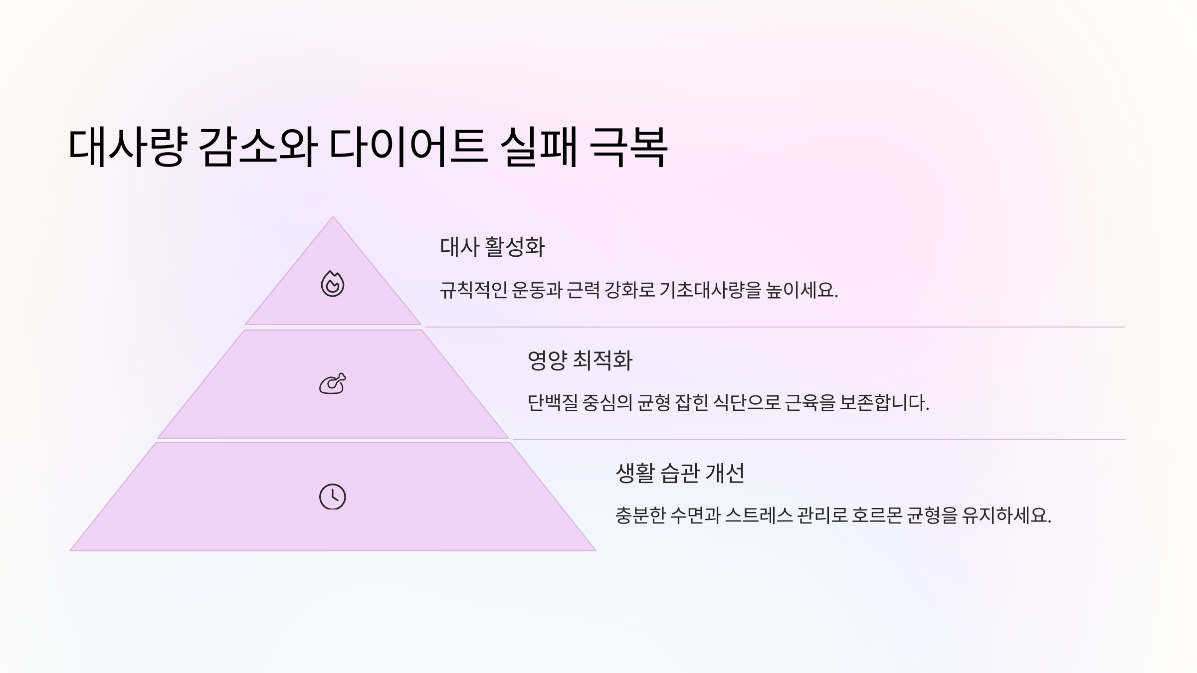 중년 이후의 다이어트는 '칼로리 적게 먹기'가 전부가 아니에요. 오히려 대사량을 올리는 방향으로 전략을 세워야 해요. 그 방법은 근육량을 유지하고, 규칙적인 운동 루틴을 만들고, 수면과 스트레스도 함께 관리하는 것이죠.
