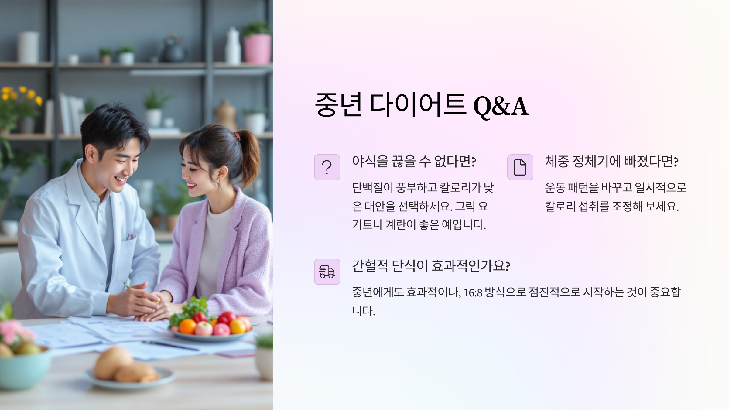 A6. 중년에는 단기 다이어트보다 건강을 고려한 장기 전략이 훨씬 효과적이에요. 무리하면 요요가 와요.
