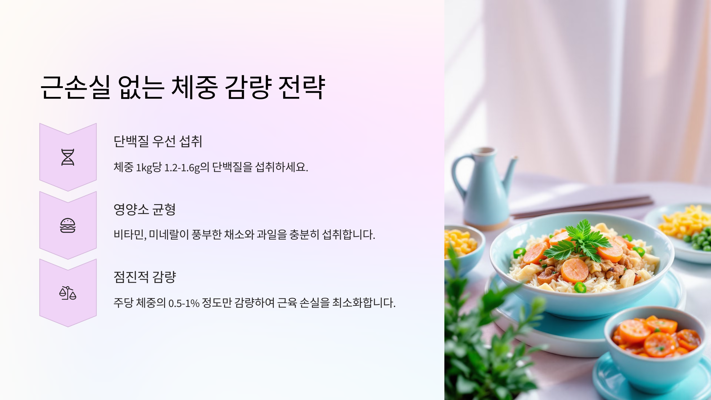 중년 다이어트에서 가장 큰 함정 중 하나가 바로 '근손실'이에요. 무작정 식사량을 줄이거나 굶는 다이어트는 몸속 단백질을 분해해 에너지로 쓰게 만들기 때문에 오히려 근육량이 줄어들어요.