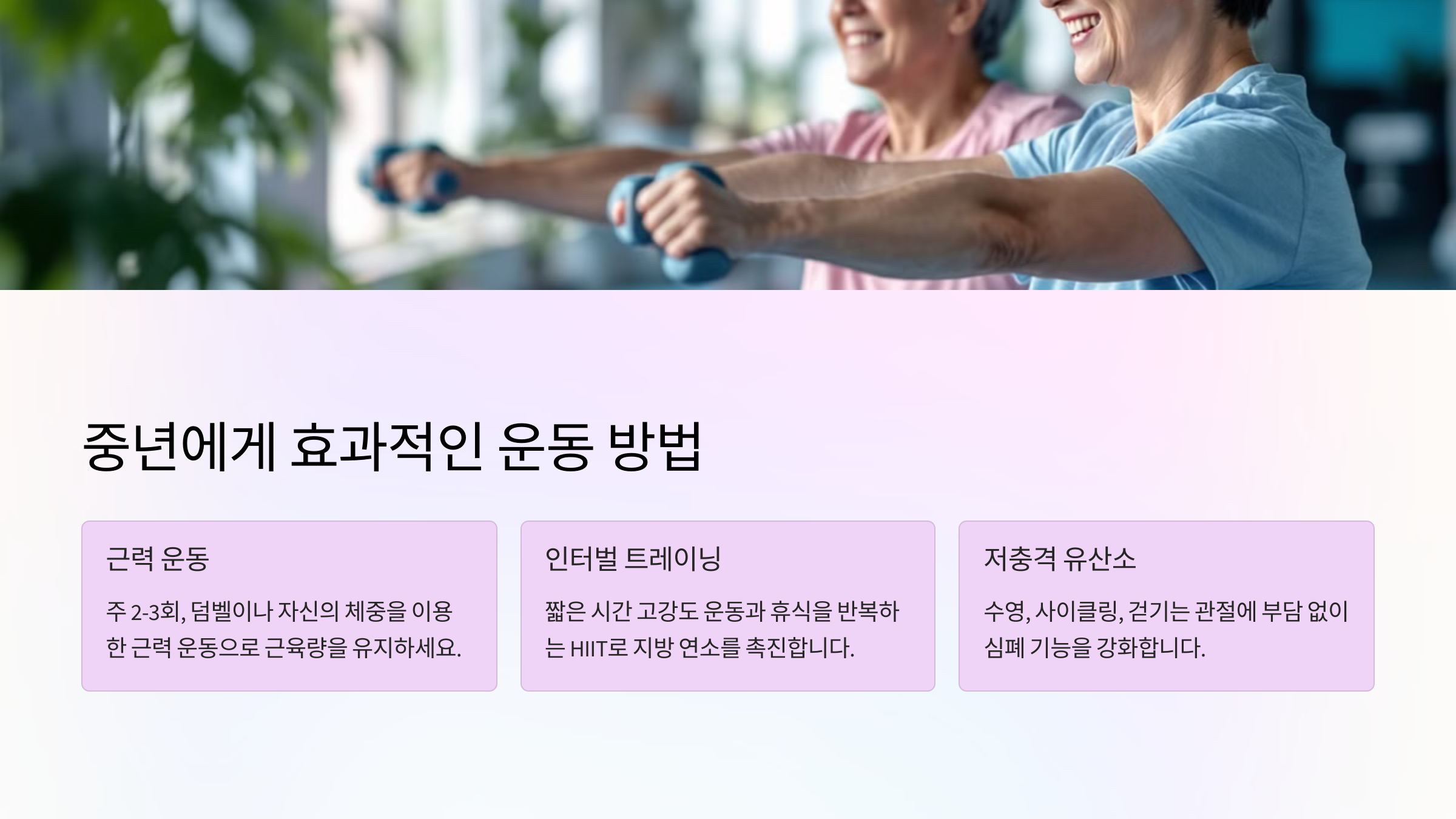 중년 이후에 가장 효과적인 운동은 유산소와 근력운동의 적절한 조합이에요. 단순히 걷기나 자전거 타기만으로는 부족할 수 있기 때문에, 근육량을 유지하거나 늘릴 수 있는 웨이트 트레이닝이 반드시 병행돼야 해요.
