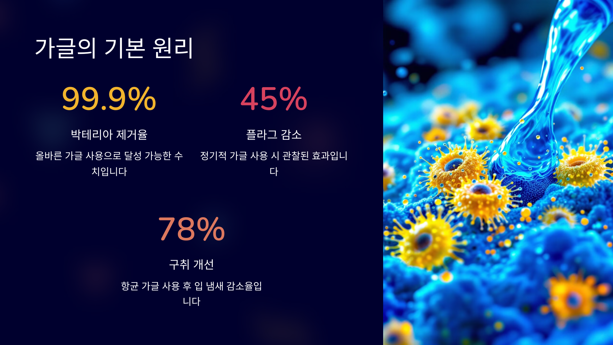 더불어 구강암 예방에도 일정 부분 도움이 될 수 있어요. 정기적인 가글은 혐기성 세균이 생성하는 발암 물질 농도를 낮춰준다고 알려져 있거든요. 물론 정기적인 치과 검진과 병행해야 진짜 효과를 볼 수 있어요. 🔬