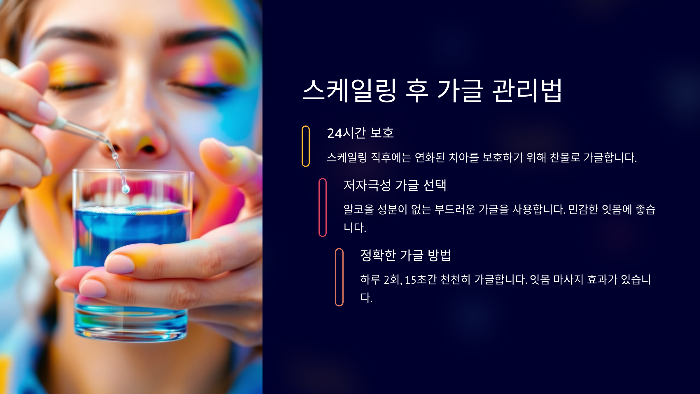 스케일링은 치석과 플라크를 제거해주는 시술이에요. 하지만 그 과정에서 잇몸이 일시적으로 약해지고 민감해지기 때문에, 가글 선택도 조심해야 해요. 시술 직후는 너무 자극적인 가글보다는 순한 제품을 사용하는 게 좋아요.