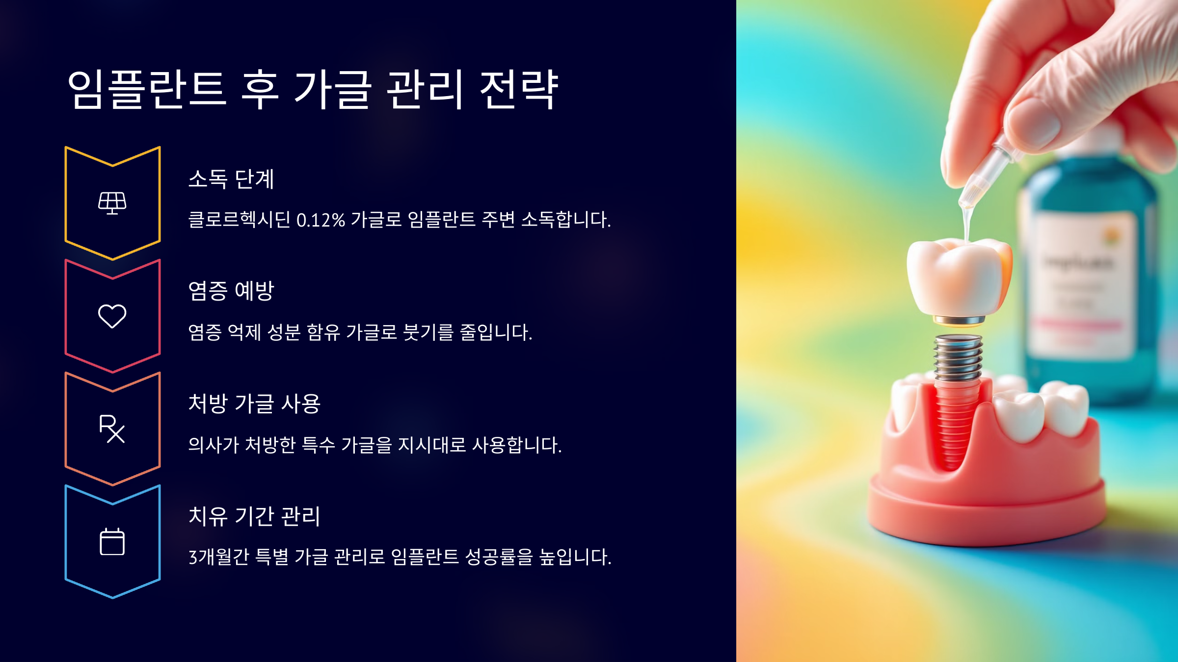 임플란트 시술 후엔 세균 감염에 특히 주의해야 해요. 인공 치근이 잇몸과 골조직에 제대로 붙어야 하는데, 이 과정에서 감염되면 실패 확률이 높아지거든요. 그래서 시술 직후엔 처방 가글 사용이 필수예요.