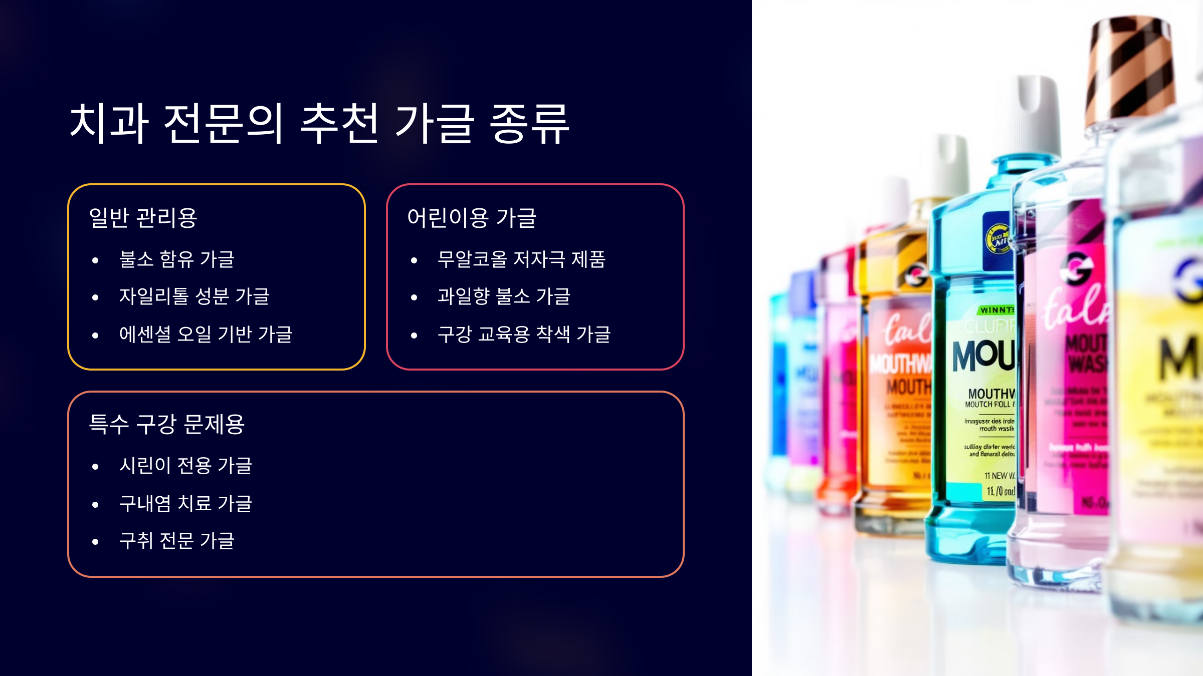 치과에서 가장 많이 추천하는 성분은 클로르헥시딘이에요. 살균력이 뛰어나고 치주염 초기 증상에 큰 도움이 되죠. 하지만 장기 사용 시 착색이나 미각 변화가 있을 수 있어요. 따라서 2주 이상 장기 사용은 반드시 치과의사의 지시에 따라야 해요.