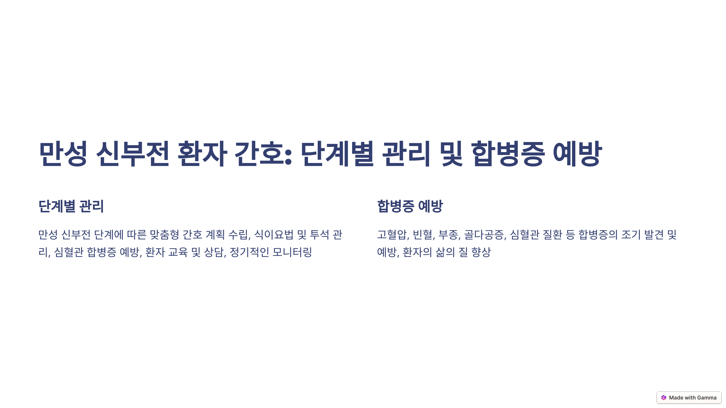 만성 신부전(CKD)은 신장 기능이 점진적으로 저하되는 질환으로, 완치가 어려운 경우가 많아요. 하지만 적절한 간호와 관리로 진행 속도를 늦추고 합병증을 예방할 수 있어요.