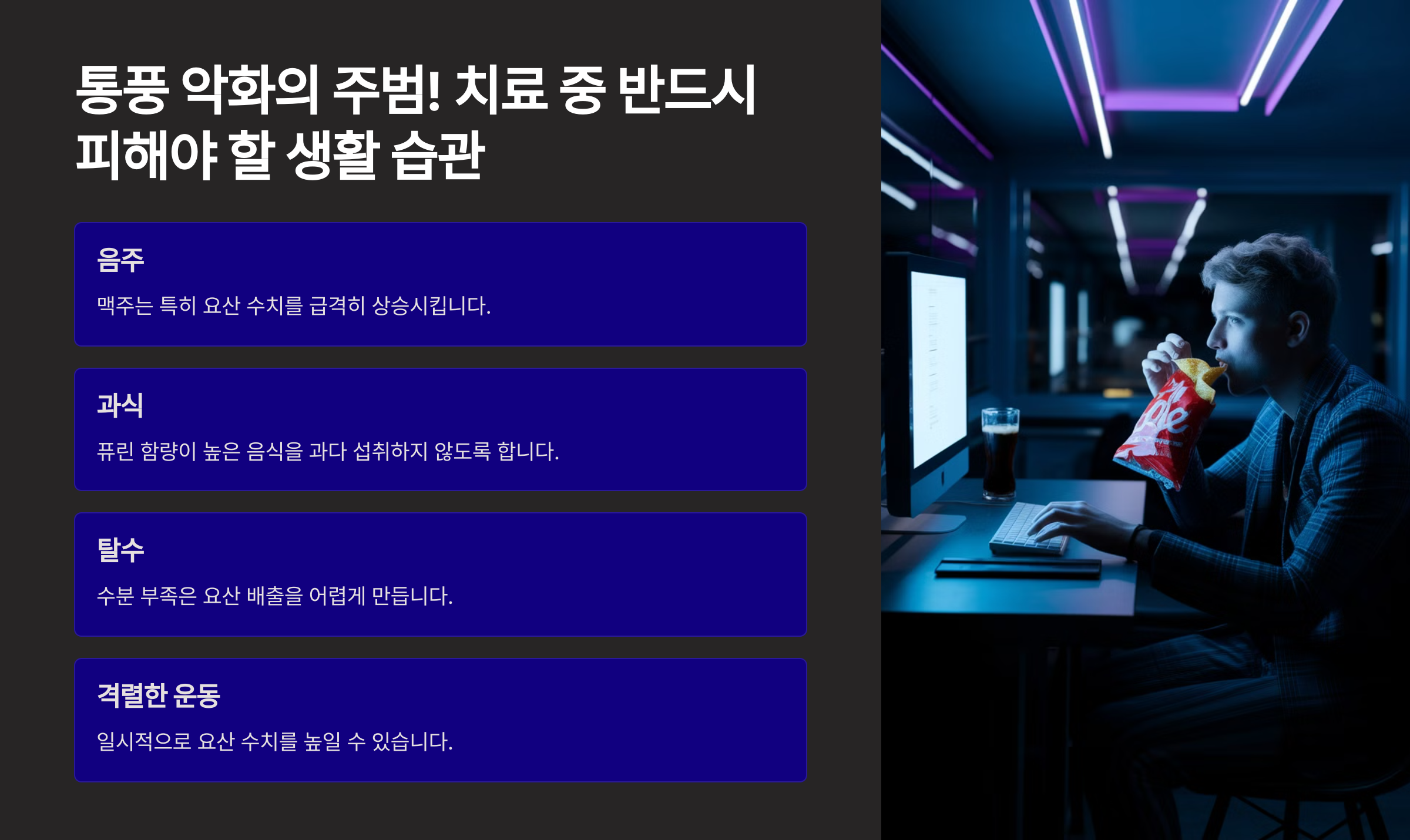 위의 습관을 피하면 **통풍 발작을 줄이고, 장기적으로 건강한 생활을 유지할 수 있어요**. 특히 알코올과 푸린이 많은 음식은 요산 수치를 급격히 상승시키므로 조심해야 해요.