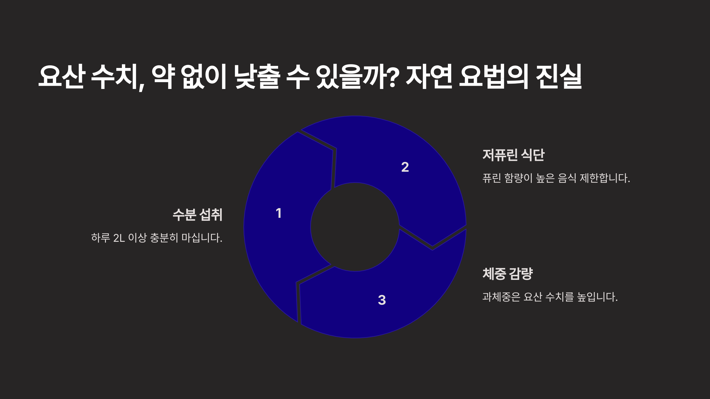 요산 수치를 낮추는 가장 효과적인 방법은 약물 치료지만, **생활 습관을 개선하면 자연적으로도 어느 정도 조절할 수 있어요**. 하지만 통풍이 심하거나 요산 수치가 높다면 약물 치료와 병행하는 것이 가장 안전해요.